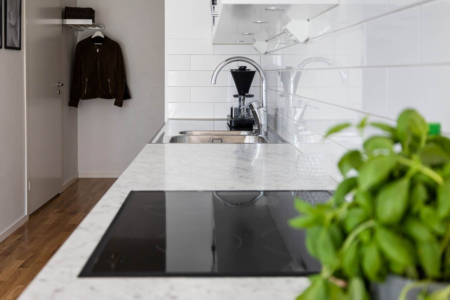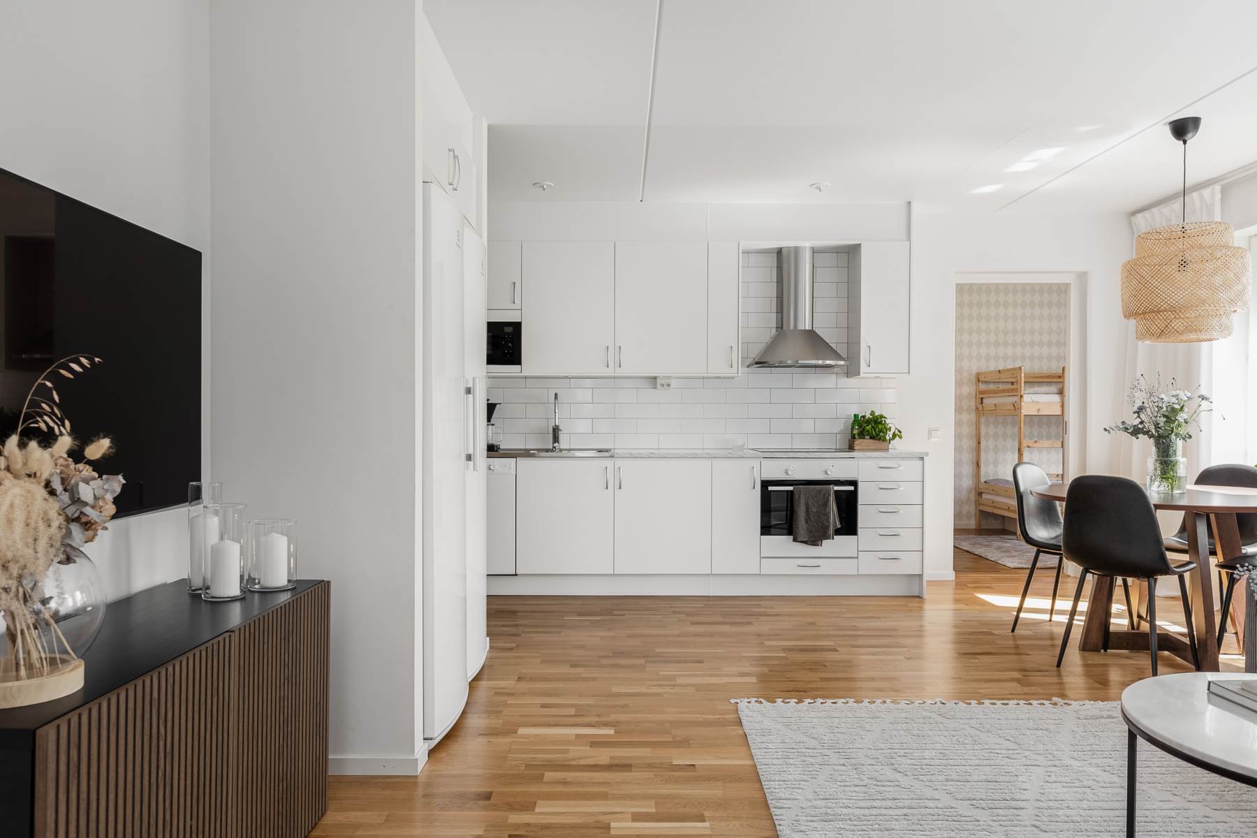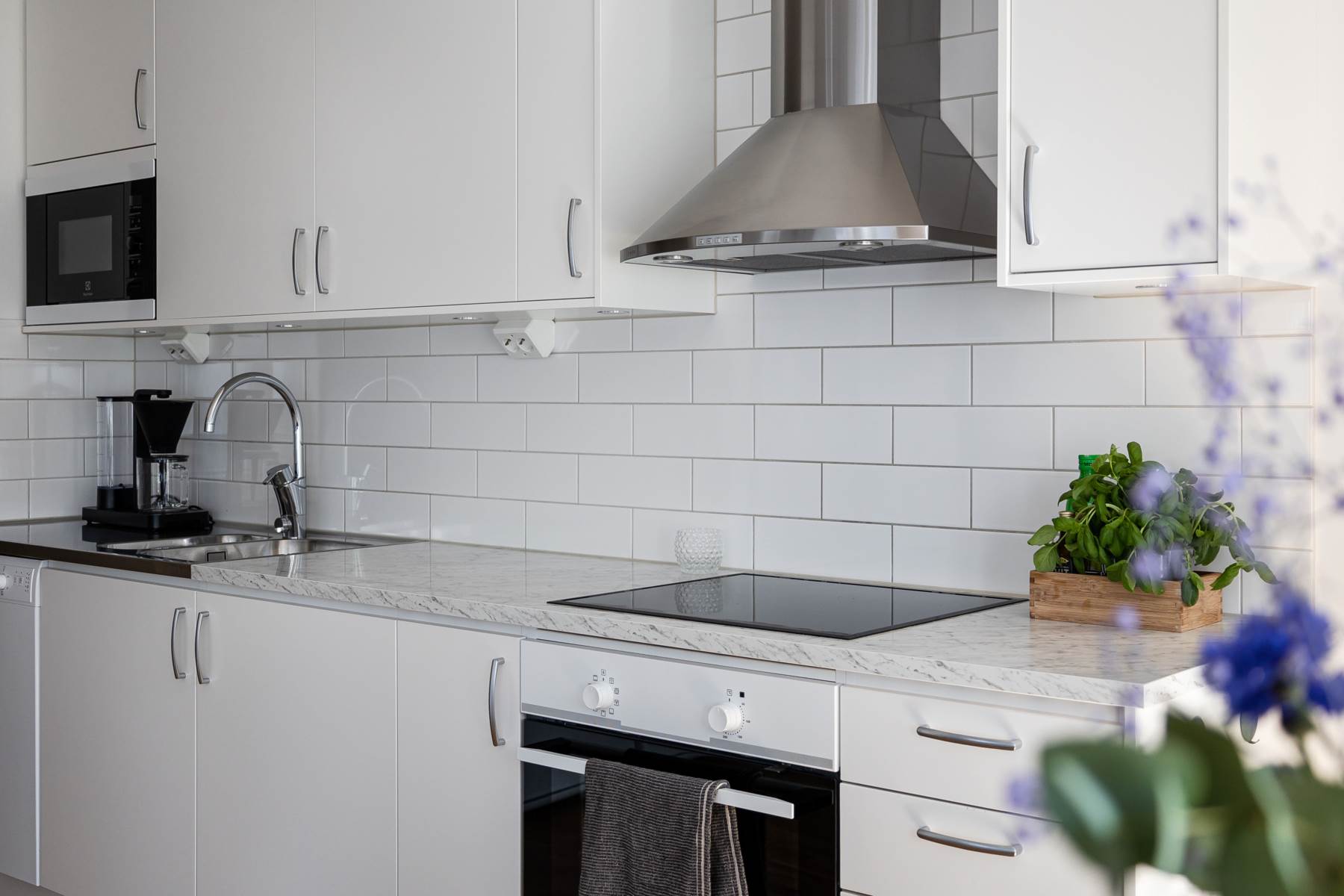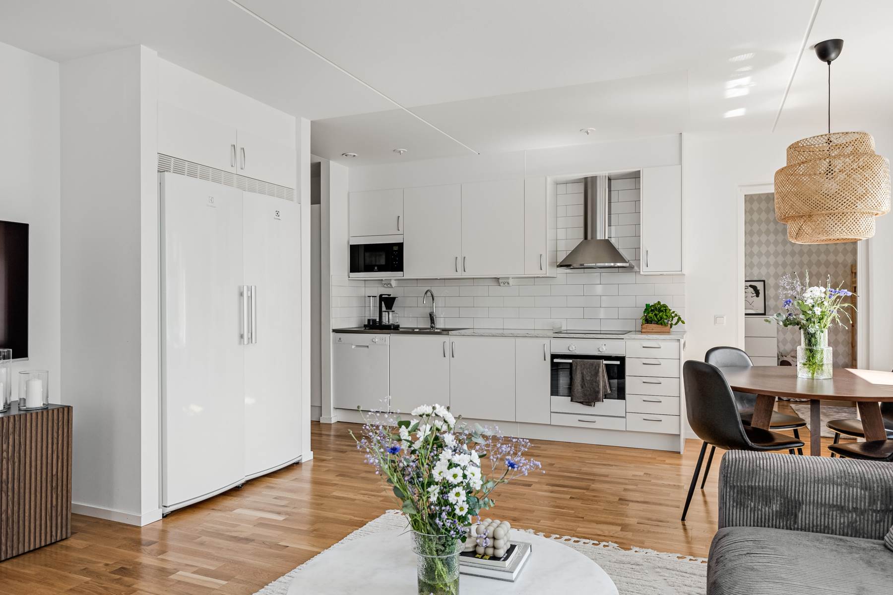 Vitt och stilrent kök med släta luckor, en ljusgrå laminatskiva samt en diskbänk. Ovanför arbetsytorna är det en vitt kakel. Vitvarorna består av en hel kyl och frys, ugn, spishäll, fläkt och en micro. Rummet är öppet mot vardagsrummet vilket gör det ljust och luftigt.