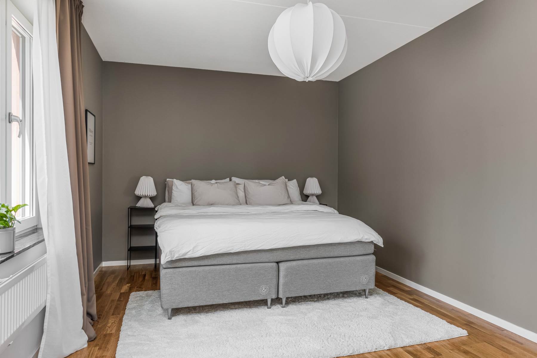 Master bedroom med gott om plats för en dubbelsäng. Här finns det två vita garderober, det är målade väggar och en parkett på golvet.