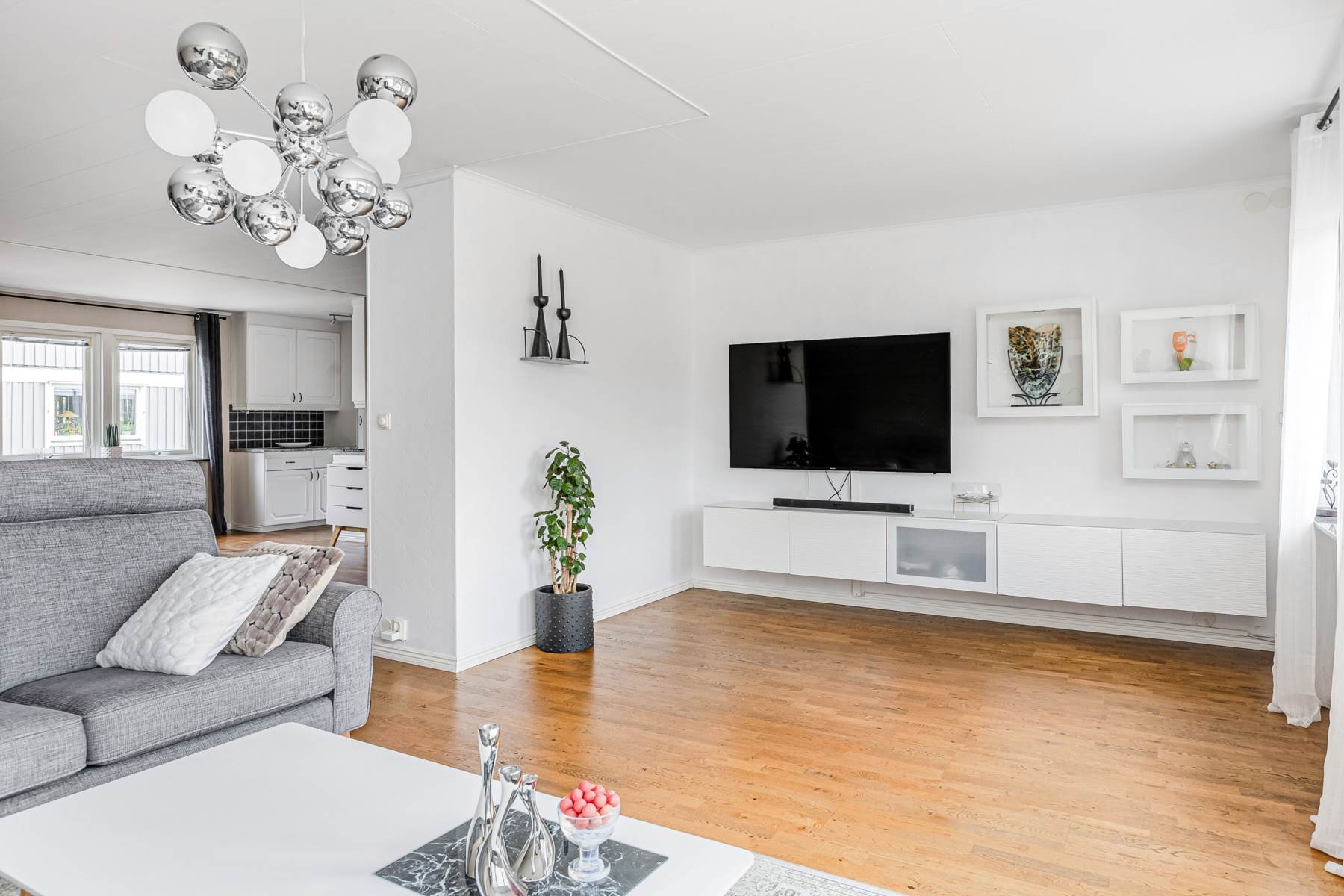 Ett ljust, öppet och välplanerat vardagsrum med braskamin med stora, lättmöblerade ytor, gott om plats för soffa och matgrupp och fönster åt två håll. Rummet har vita väggar och ljust golv.