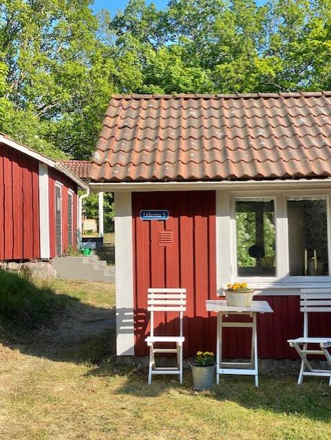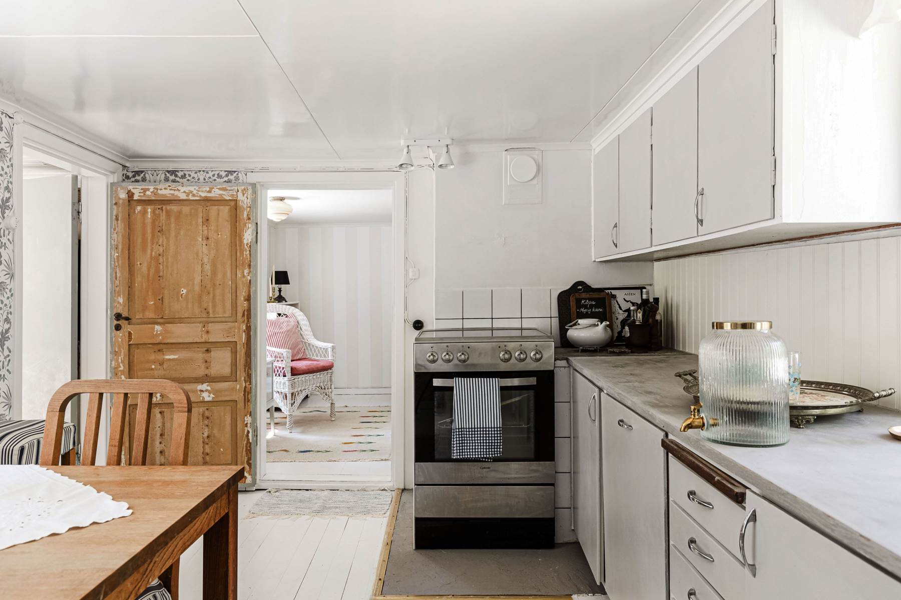Mycket smakfullt inrett 1800-talstorp med vitmålade trägolv, tidstypiska tapeter, gråmålat kök med köksbänk i slipad betong och öppen spis i vardagsrummet. På altanen mot baksidan invid det rödmålade planket är ett litet utekök installerat med vatten framdraget från egen vattenkälla.