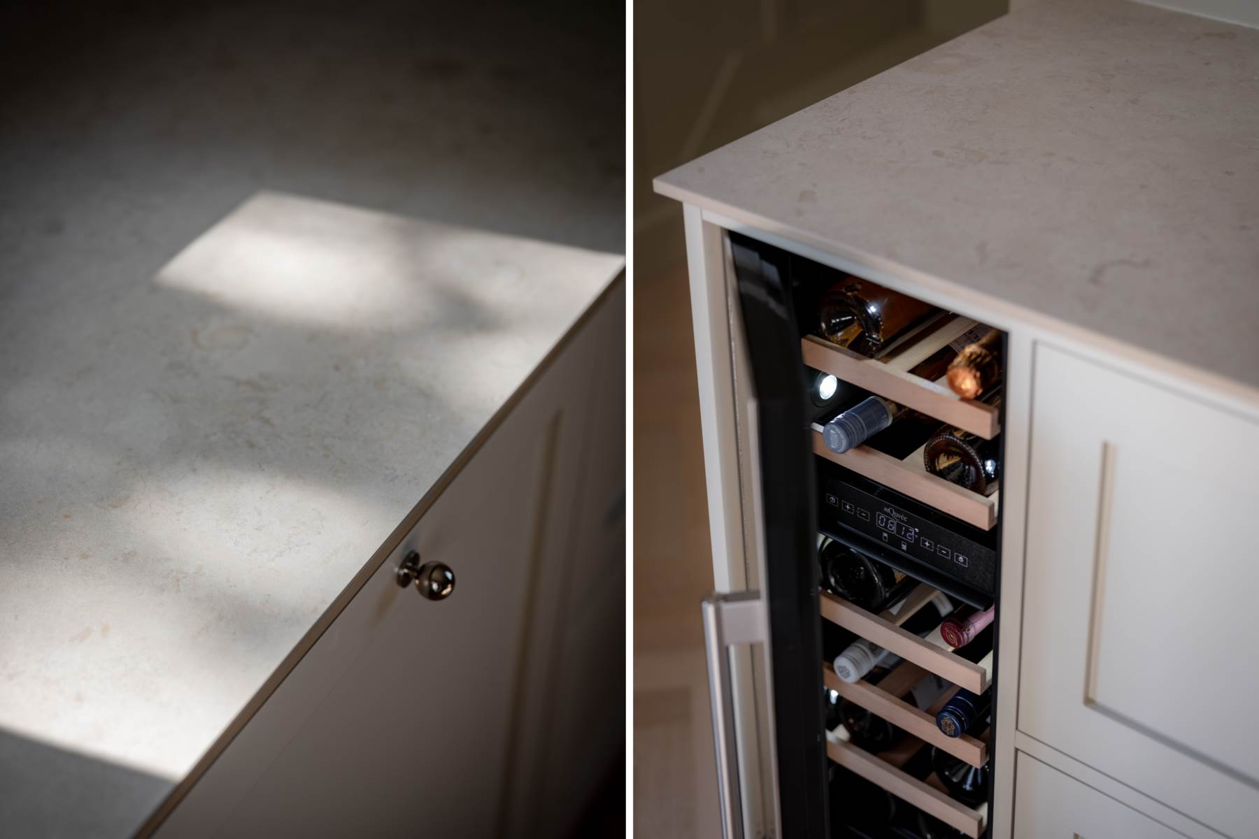 Ljust och härligt kök från Nordiska Kök med stora fönsterpartier och fantastisk utsikt över trädgården. Matplats för ett flertal personer. Köksluckor i beige kulör och vitvaror genomgående från Siemens. Bänkskiva i ljus kalksten. Fiskbensparkett och ljus beige kulör klär väggarna. Vinkyl från mQuvée. Mycket bra förvaring och avlastningsytor.