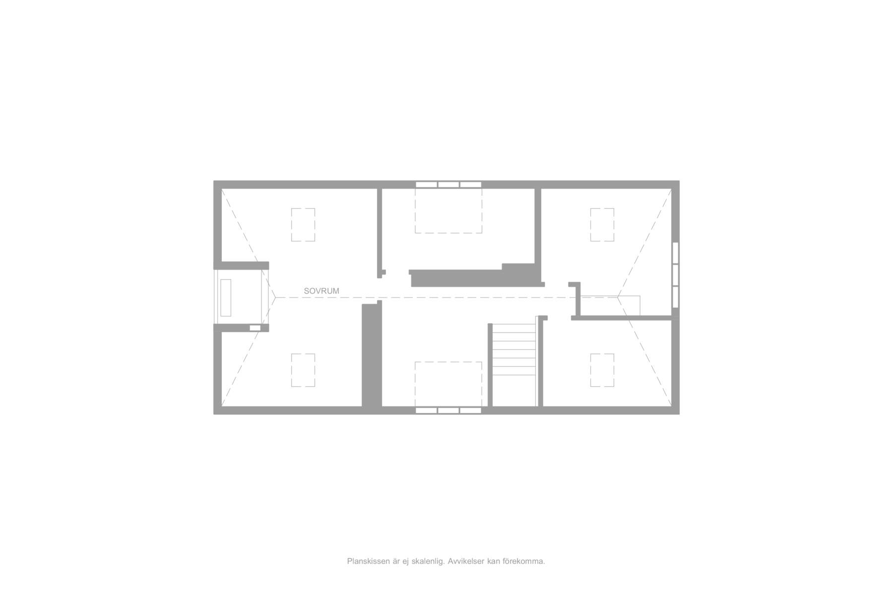 Plats för en stor säng, skrivbord och gott om plats med inbyggd garderobsvägg. Fint ljusinsläpp och trevligt takfönster gör att rummet känns oerhört ljust. Brädgolv i ljus kulör och vita väggar.