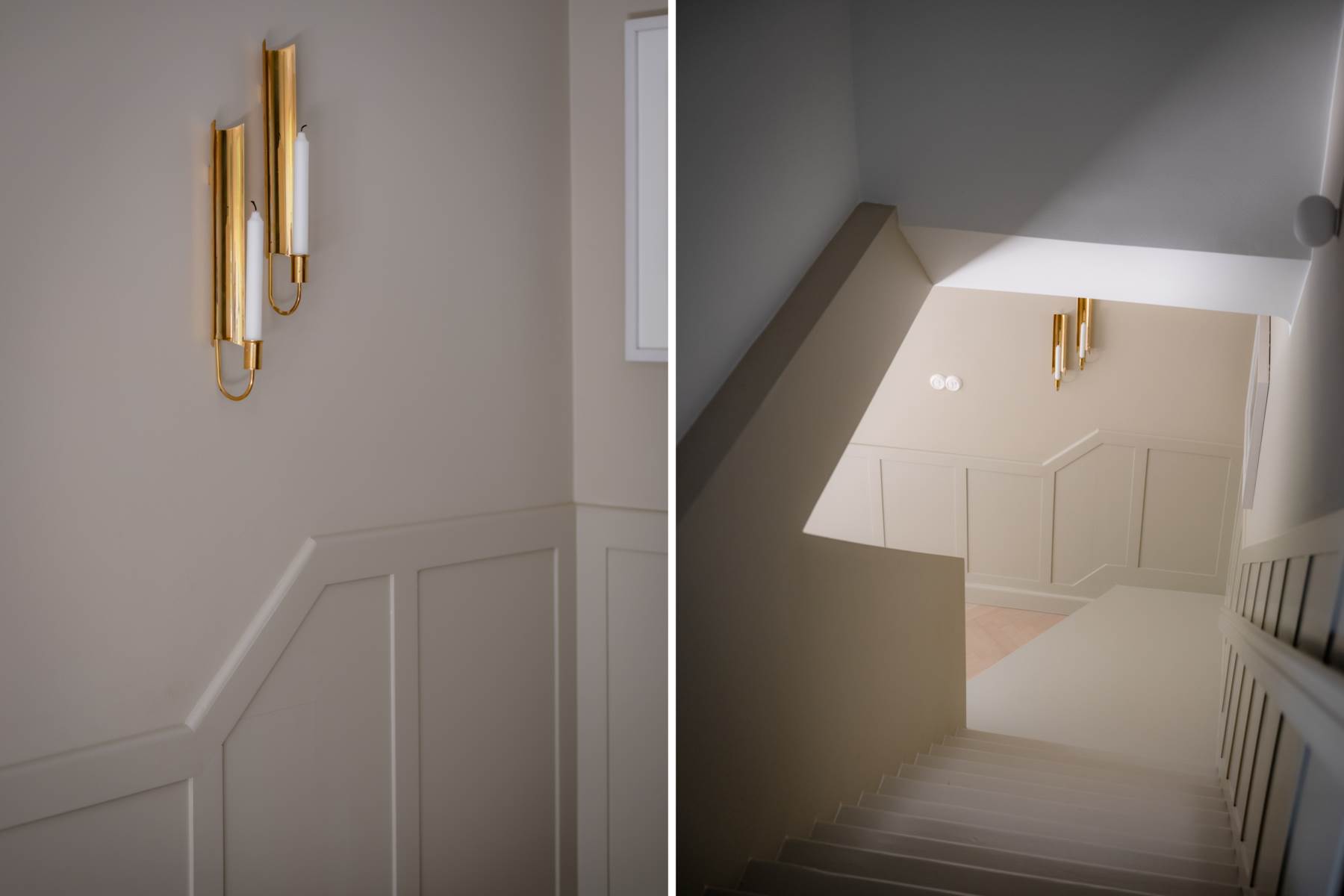 -Trappa med infräst ledbelysning i handledaren och väggarmaturer från Flos.