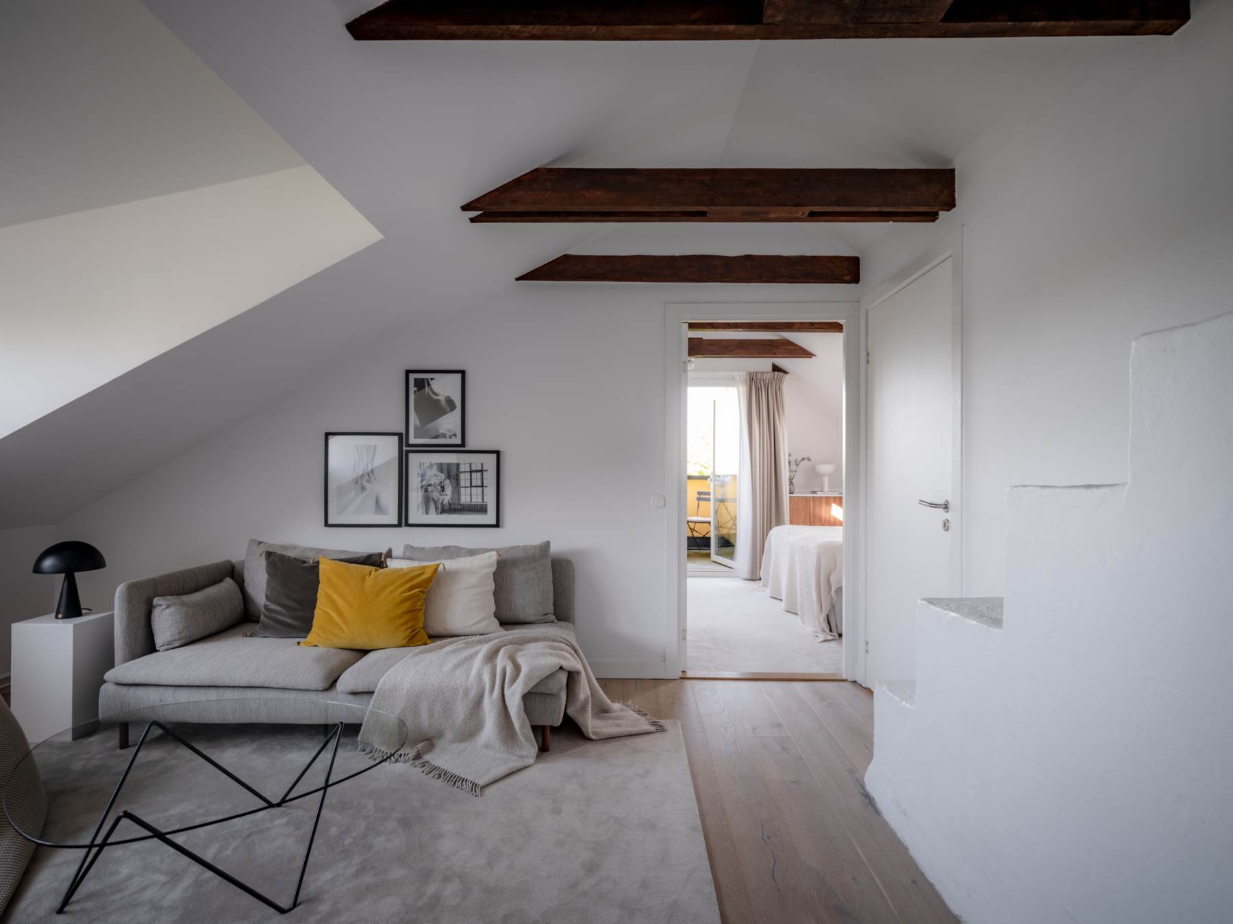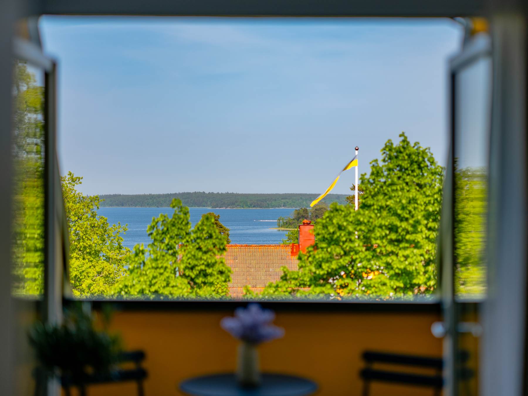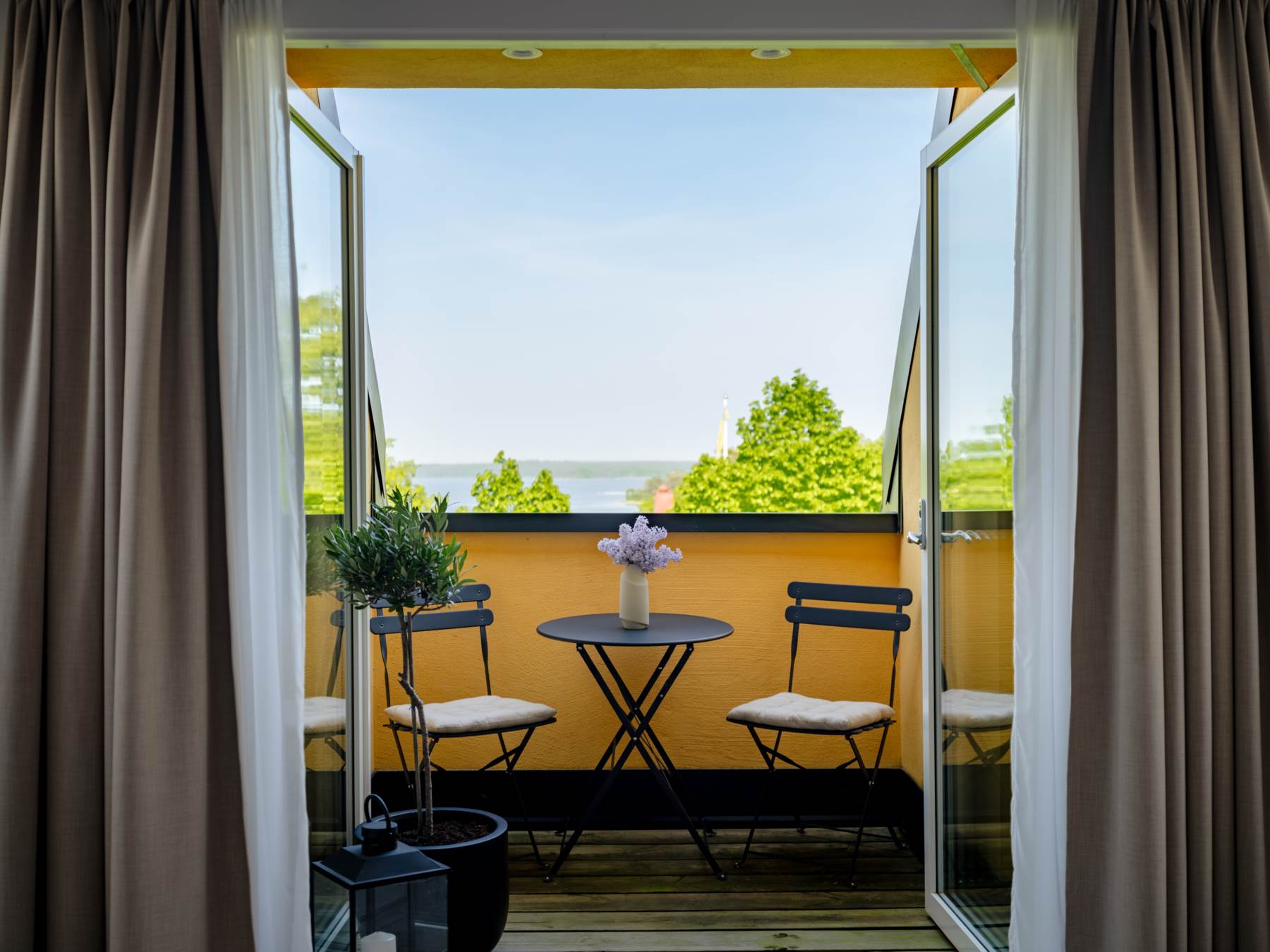 Detta sovrum är helt magiskt fint. Alldeles tyst och skapar en riktig suite känsla. Egen balkong med utsikt över vattnet. Plats för en stor säng, inbyggd förvaring som optimerar förvaringsmöjligheterna. Heltäckningsmatta i beige och vit kulör klär väggarna. Synlig takstolar adderar till tidlös charm.