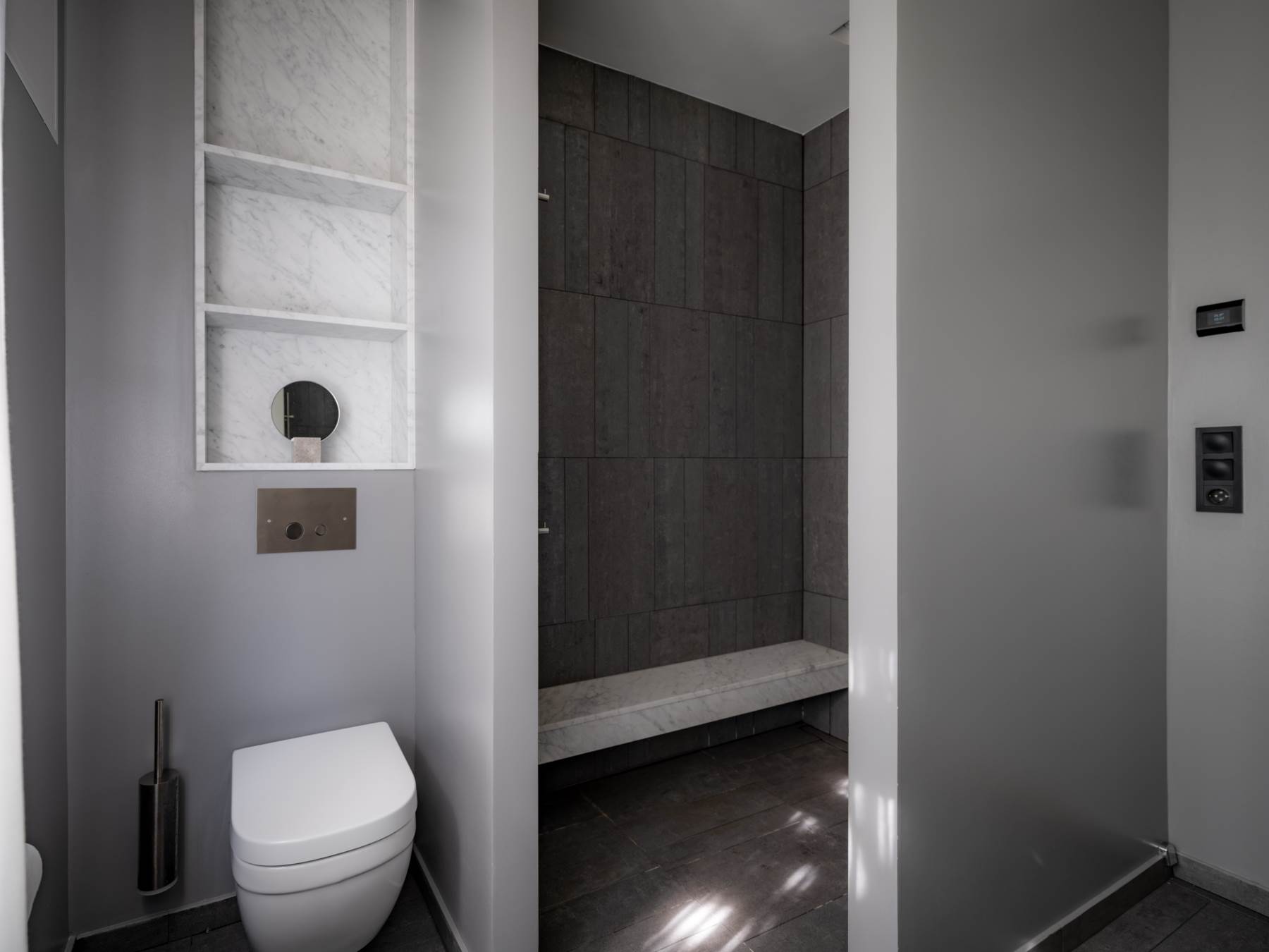 Stort badrum med vägghängd wc, rymlig dusch och handfat med gott om plats för förvaring. Grått klinkergolv och grå kulör klär väggarna. Kommod detaljer i marmor. Inbyggd hylla i marmor. (Golvvärme el).