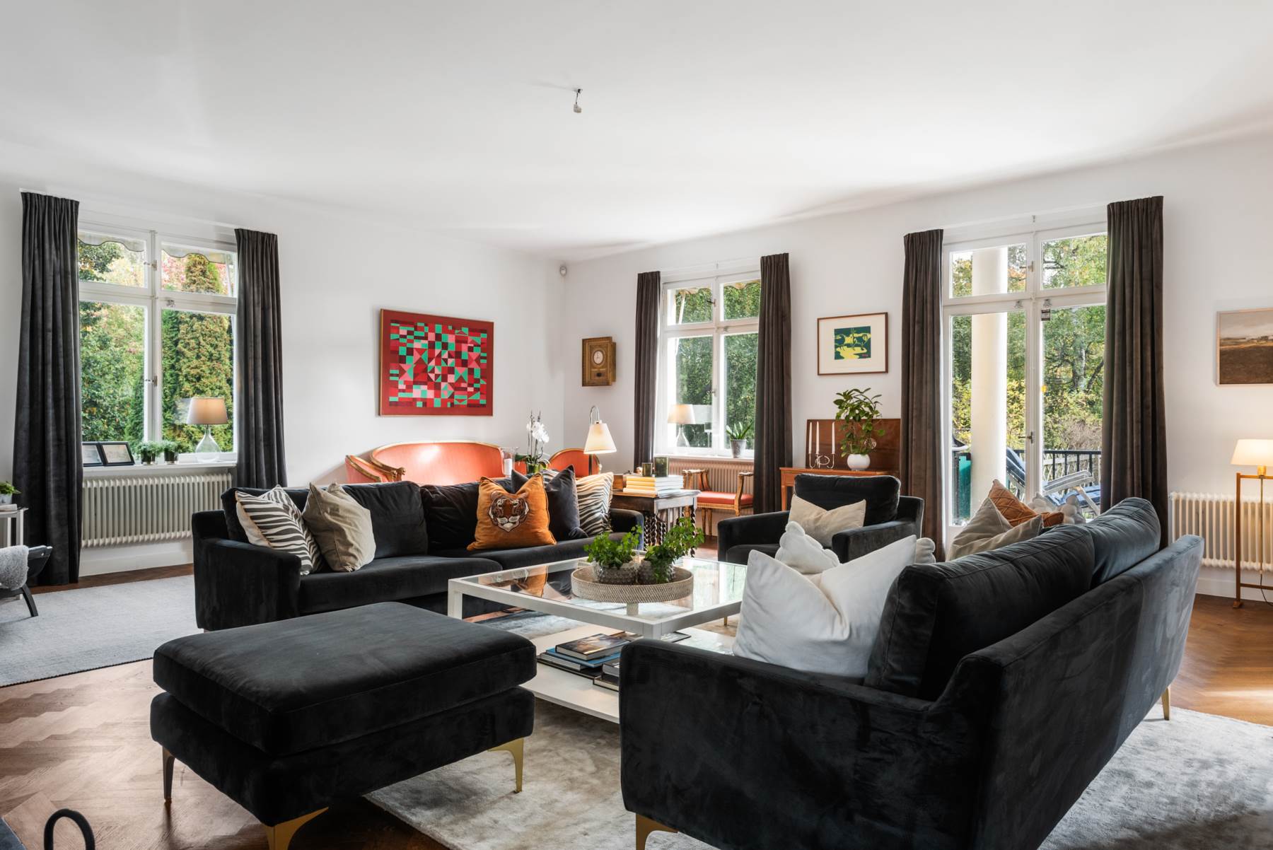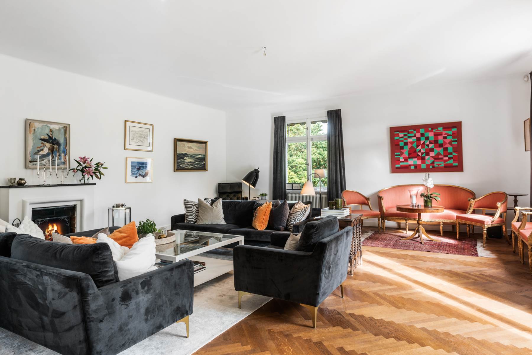 Ljuvligt vardagsrum med plats för enorma möbelarrangemang och med stor matplats. Fint ljusinsläpp från de stora fönsterpartierna. Helt ljuvligt rum med högt i tak och härlig atmosfär. Öppen spis som adderar till rummets karaktär. Utgång till stor balkong i rakt söderläge. Fiskbensparkett på golv och ljusa väggar.