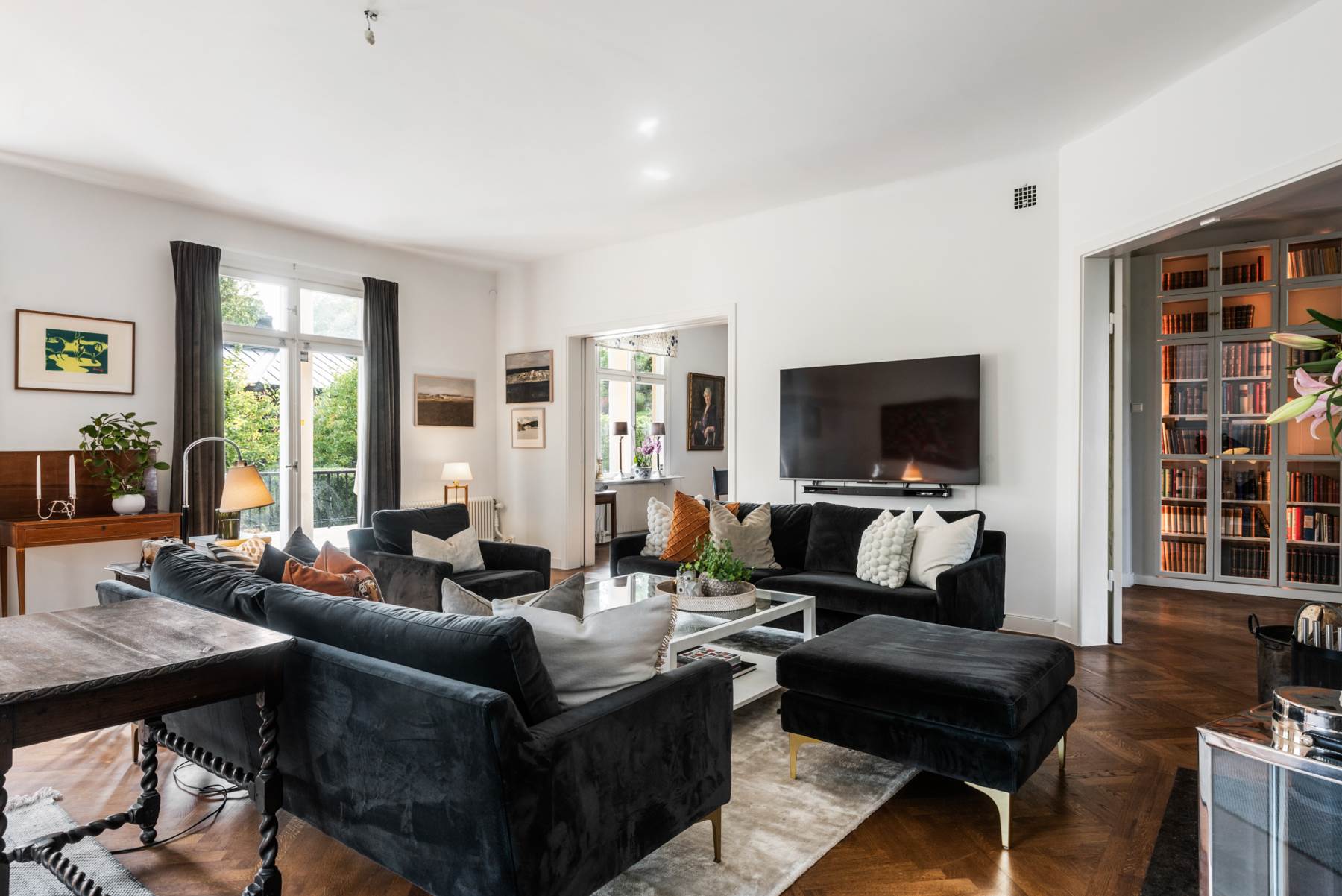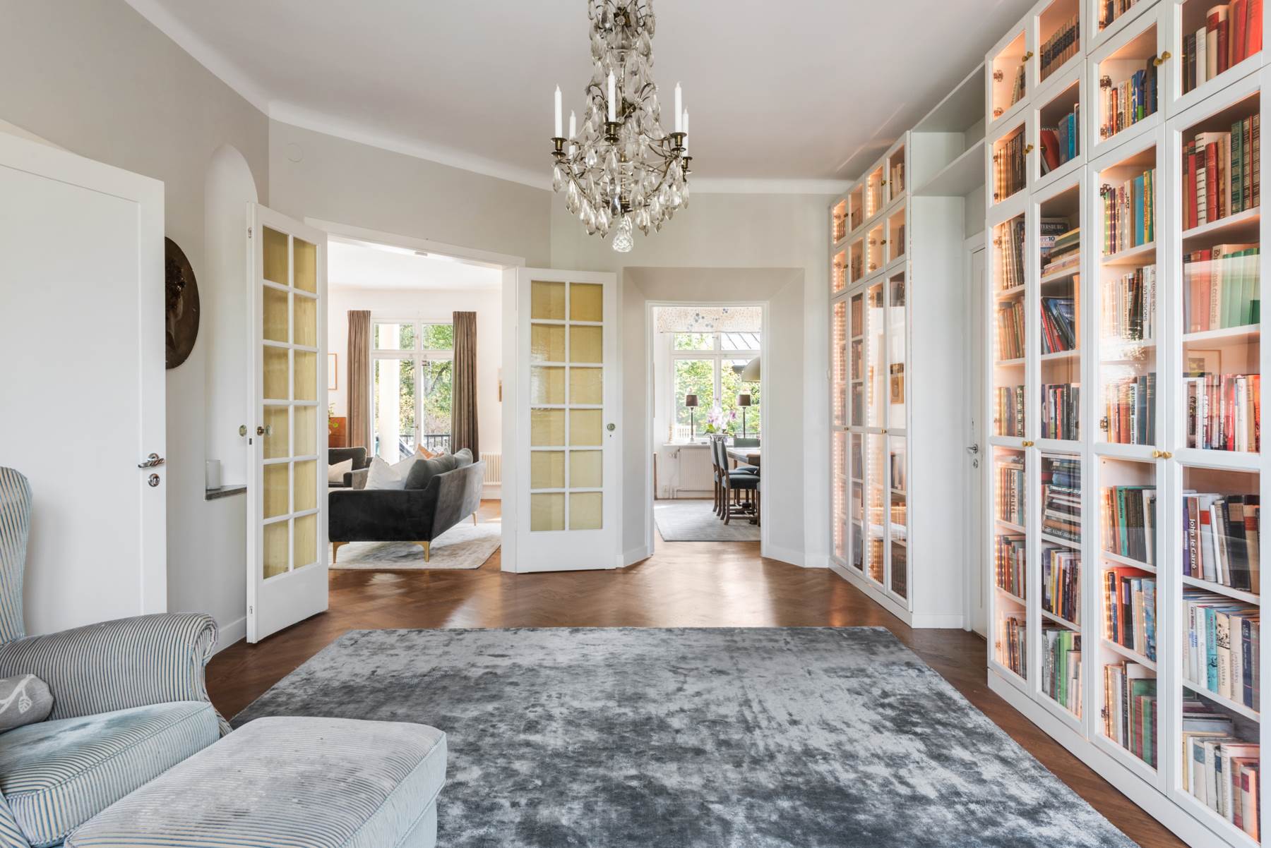 Rymlig hall med fantastisk förvaring och avhängning. Inbyggda bokhyllor med belysning som optimerar förvaringen. Fint ljusinsläpp från de stora fönsterpartierna och vy över matsalen och vardagsrummet. Mörk fiskbensparkett på golv och ljus kulör klär väggarna.