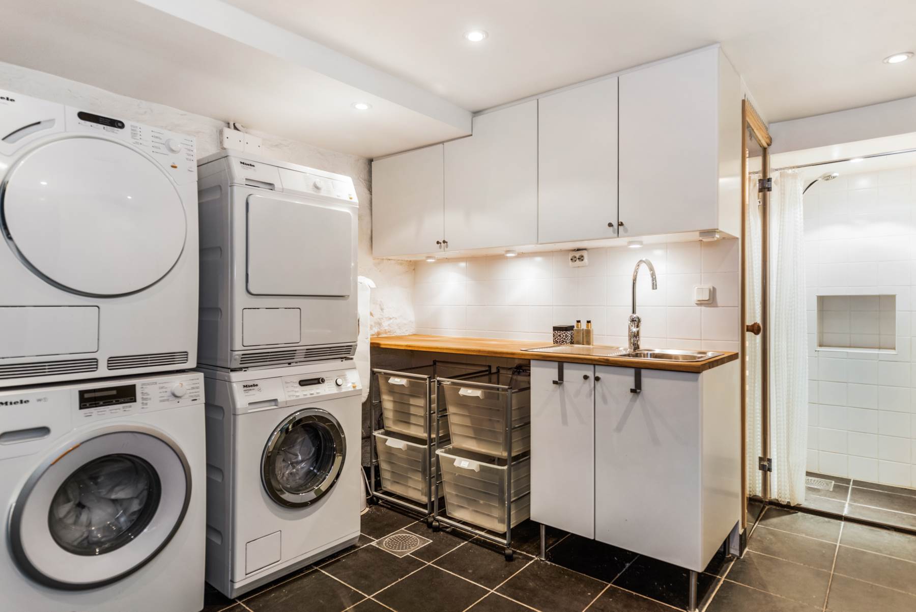 Mycket trevlig och fräsch källardel. Här finns det extra utrymme för kyl och frys och mycket extra förvaring. Dubbla tvättmaskiner och dubbla torktumlare från Miele. Fantastisk förvaring med vita skåp. Bra med handfat och bänkskiva i ek med vita överskåp. Här finns även en trevlig bastu och en rymlig dusch.