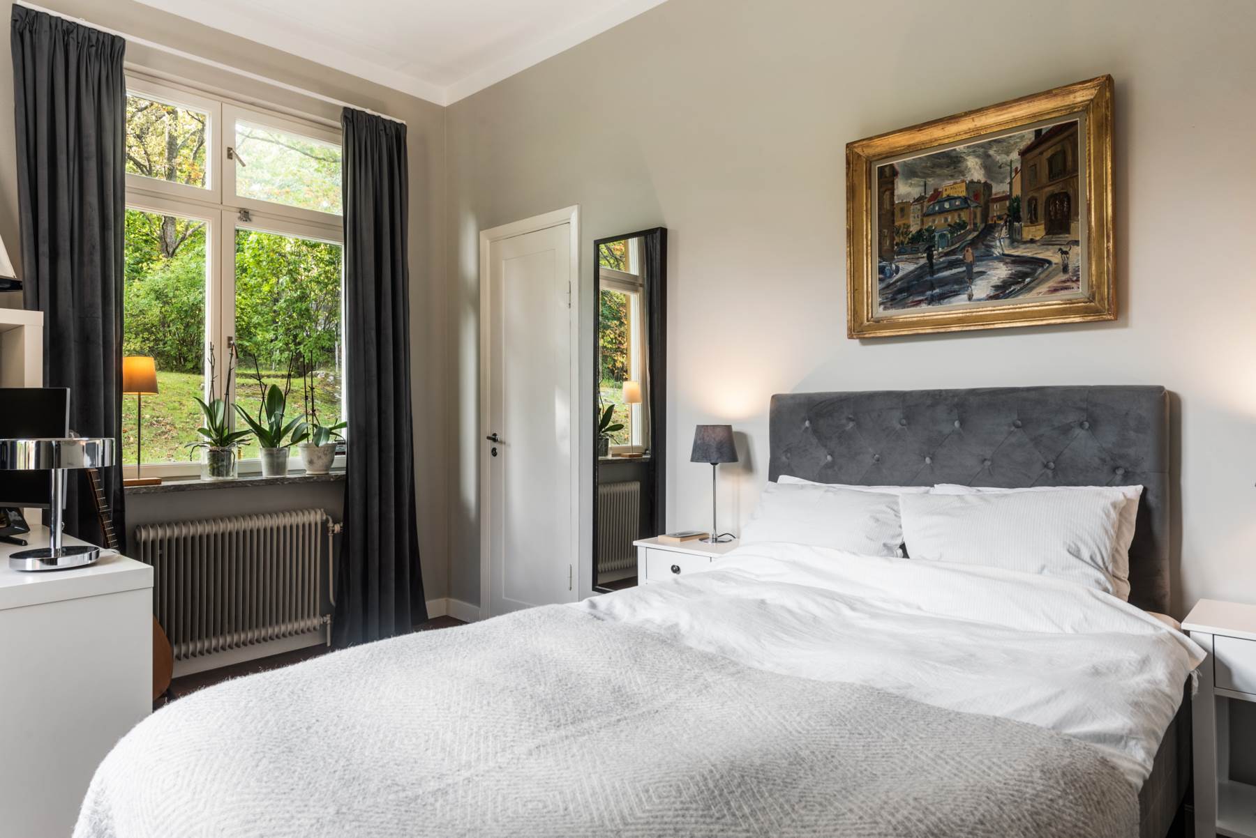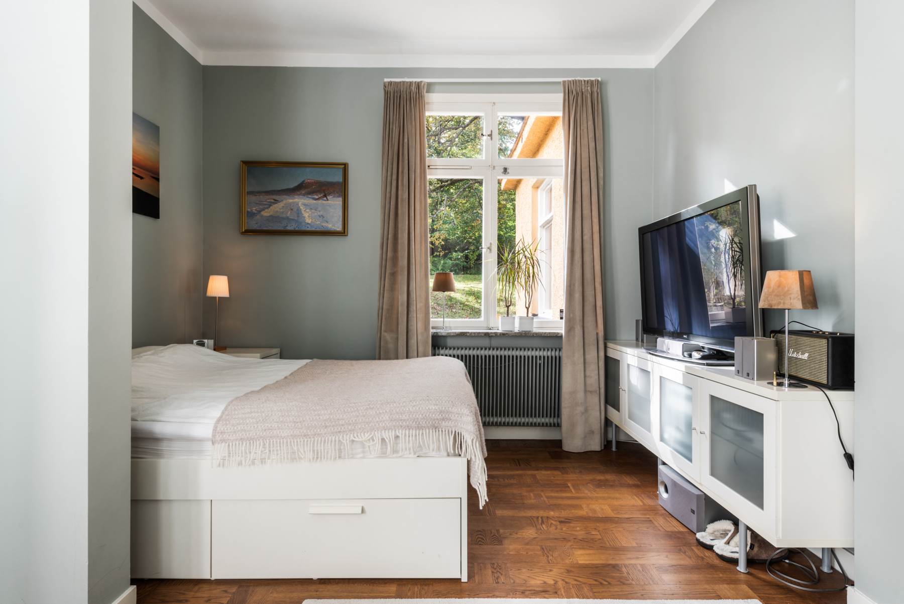 Plats för en stor säng och skrivbord. Bra inbyggd förvaring optimerar förvaringsmöjligheterna. Fint ljusinsläpp från dubbla väderstreck. Mörk fiskbensparkett och grå kulör klär väggarna.