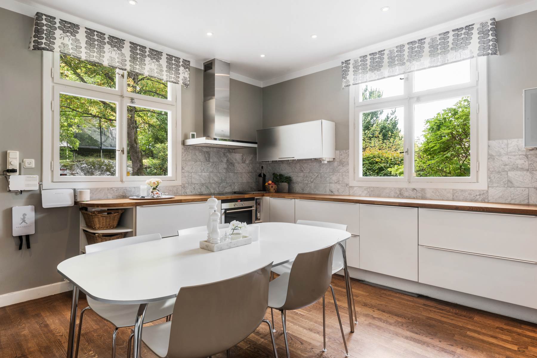 Stort kök med sittplats för ett flertal personer. Vita luckor och stänkskydd i marmor och bänkskiva i ek. Vitvaror från Siemens. Kyl och frys med ismaskin. Överskåp med grå kulör. Fantastiskt ljusinsläpp från de stora fönsterpartierna och grå kulör klär väggarna. Mörkt ekparkettgolv och spotlights i tak.