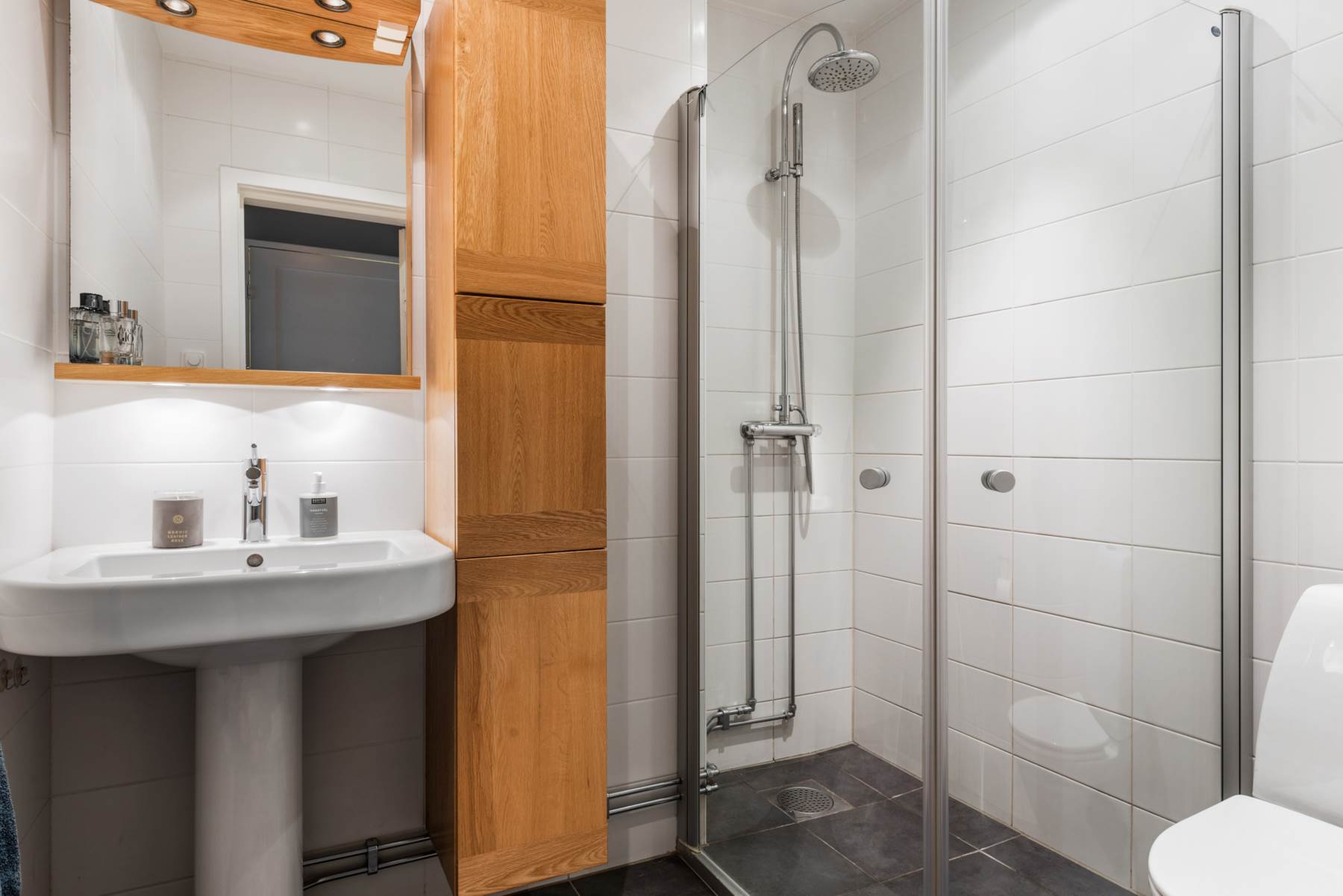 Rymligt badrum med wc, handfat och dusch. Förvaring i trä. Grått klinkergolv och vitt kakel klär väggarna.