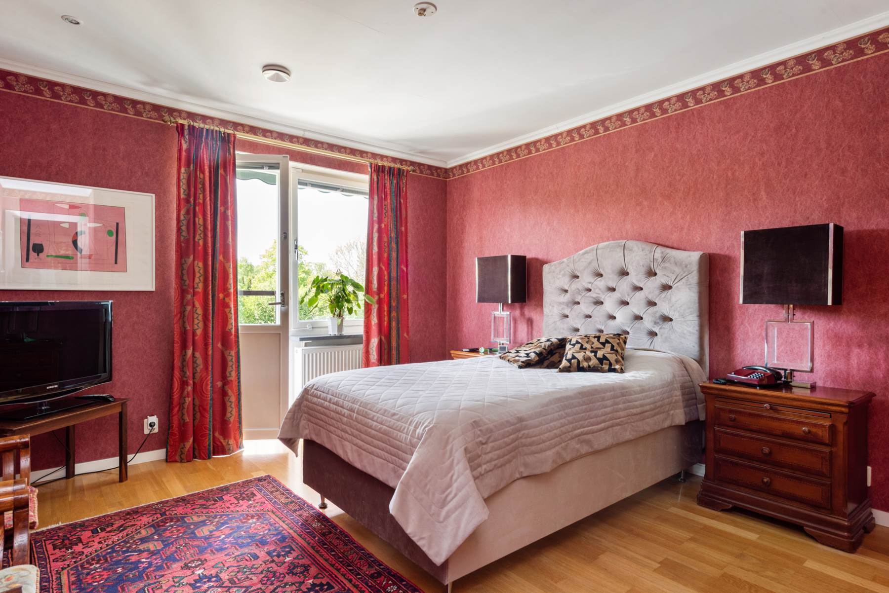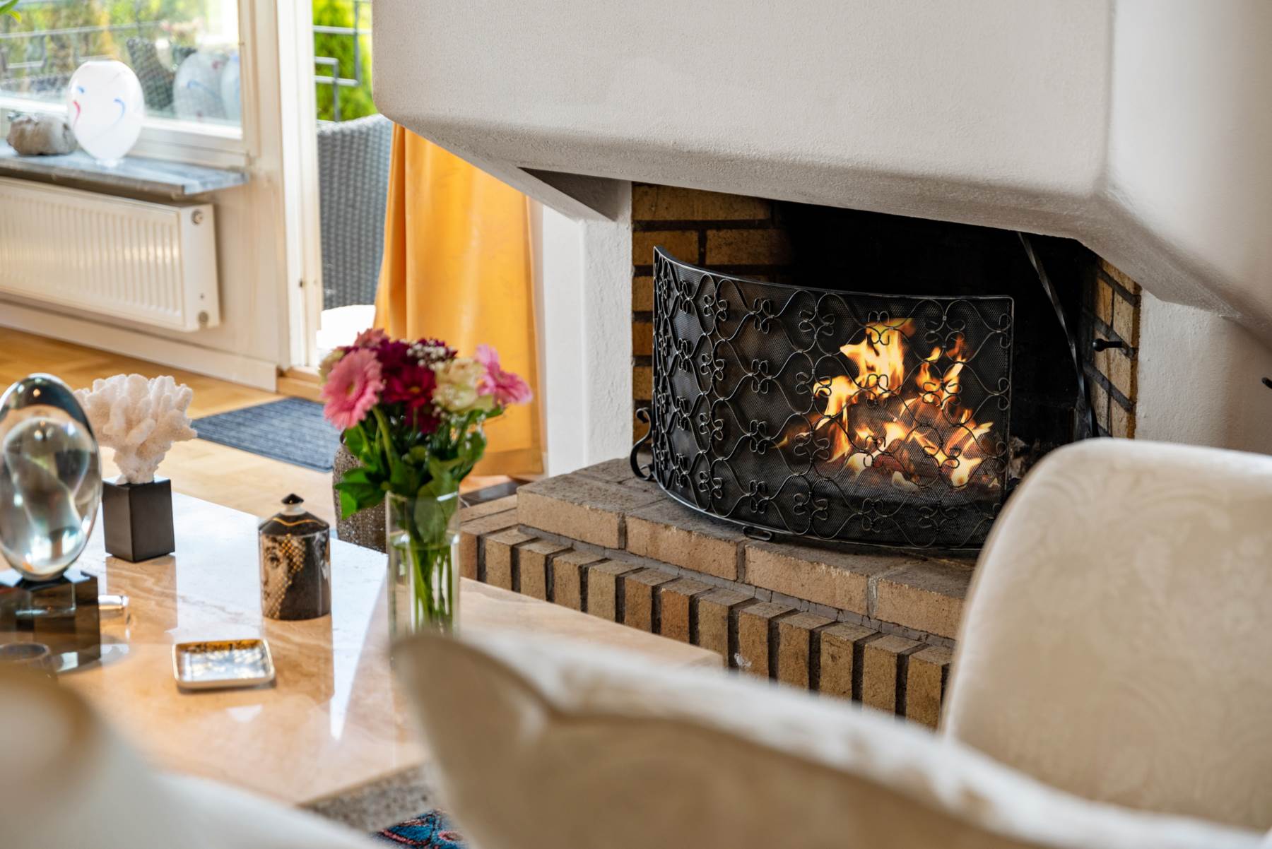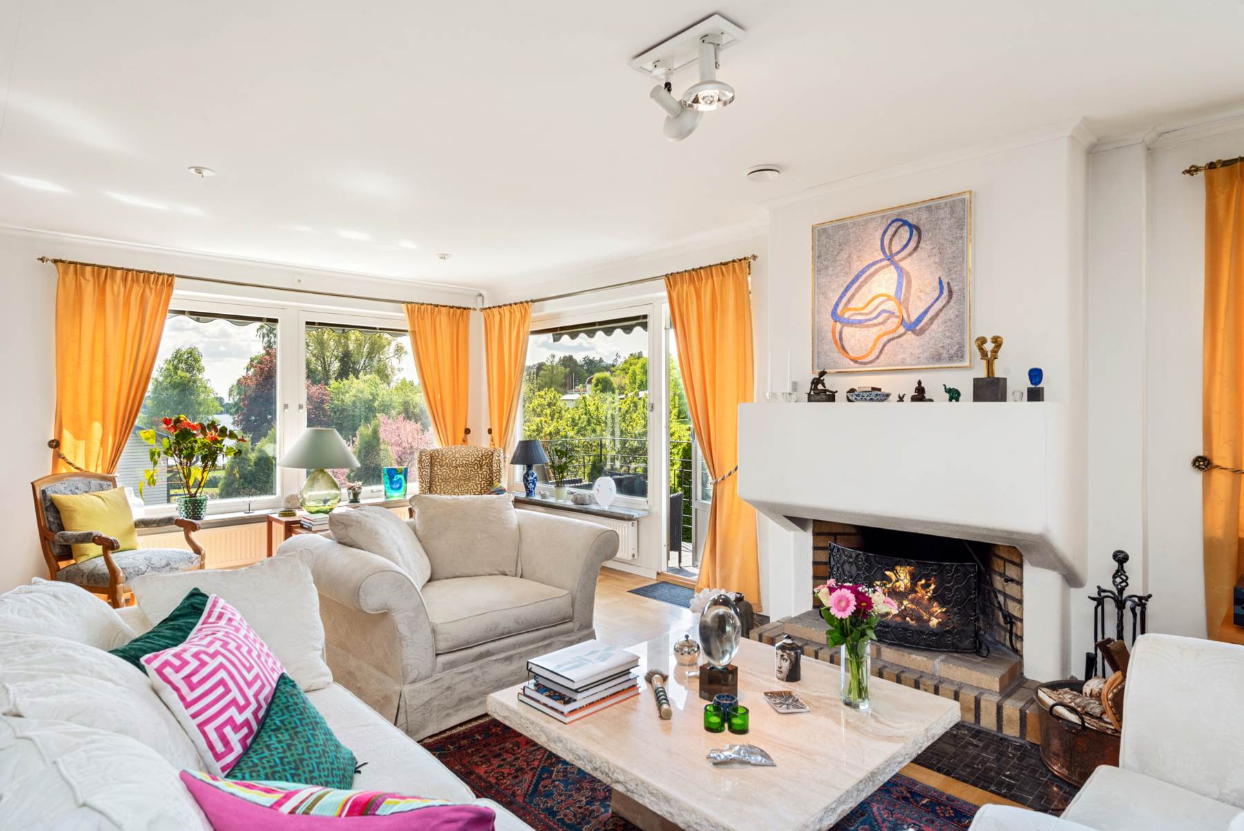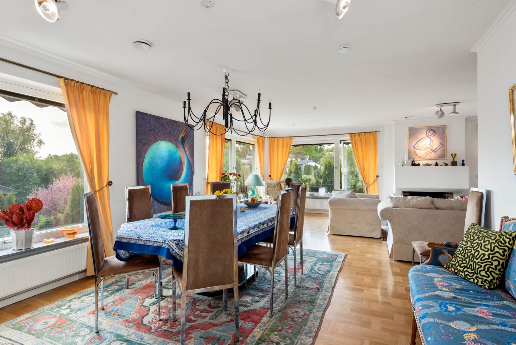 Generöst sällskapsrum med stora fönsterpartier och utgång till en härlig balkong med utsikt ned mot vattnet, den stora tomten och det fina poolområdet. Sällskapsrummet har en fin stor öppen spis, ekparkett och bra takhöjd. Plats för såväl soffgrupper som stor matsalsdel för många gäster.