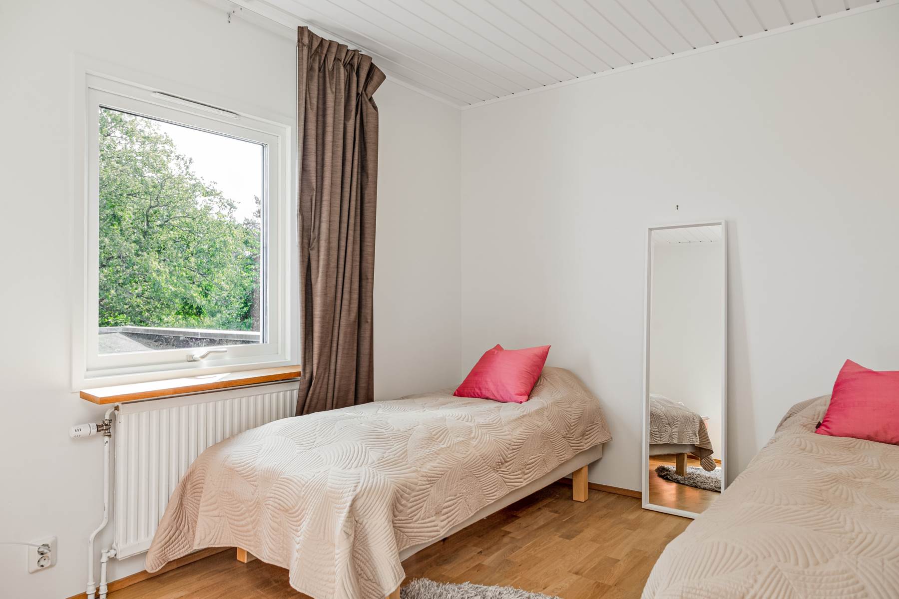 Plats för en stor säng, skrivbord och bra med förvaring. Fint ljusinsläpp med ekparkett golv och vita väggar.