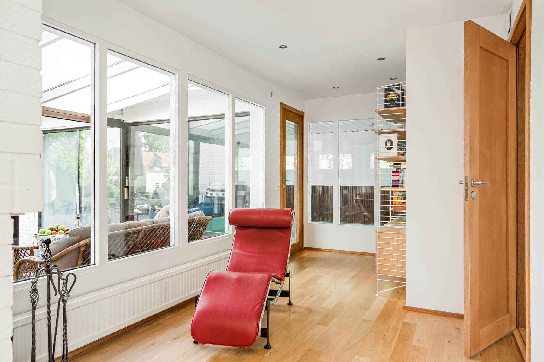 Härligt inglasat uterum med plats för stora sällskap. Med egen öppen spis som adderar det där lilla extra. Här kan man avnjuta en kvällsdrink i goda vänners lag.