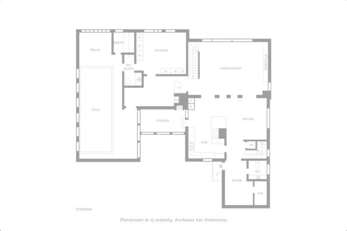 Entréplanet är ett väldigt socialt plan med stort kök, matplats och vardagsrum. Inomhuspool, bastu och ett trevligt uterum.