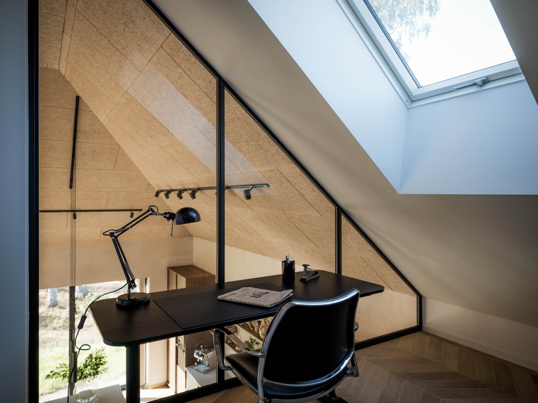 Väl inne i huset välkomnas ni av högt i tak, smakfulla materialval och balans. Med den höga takhöjden ger huset ifrån sig ett lugn som med akustiktak sprider en mjuk dovhet genom hela huset.