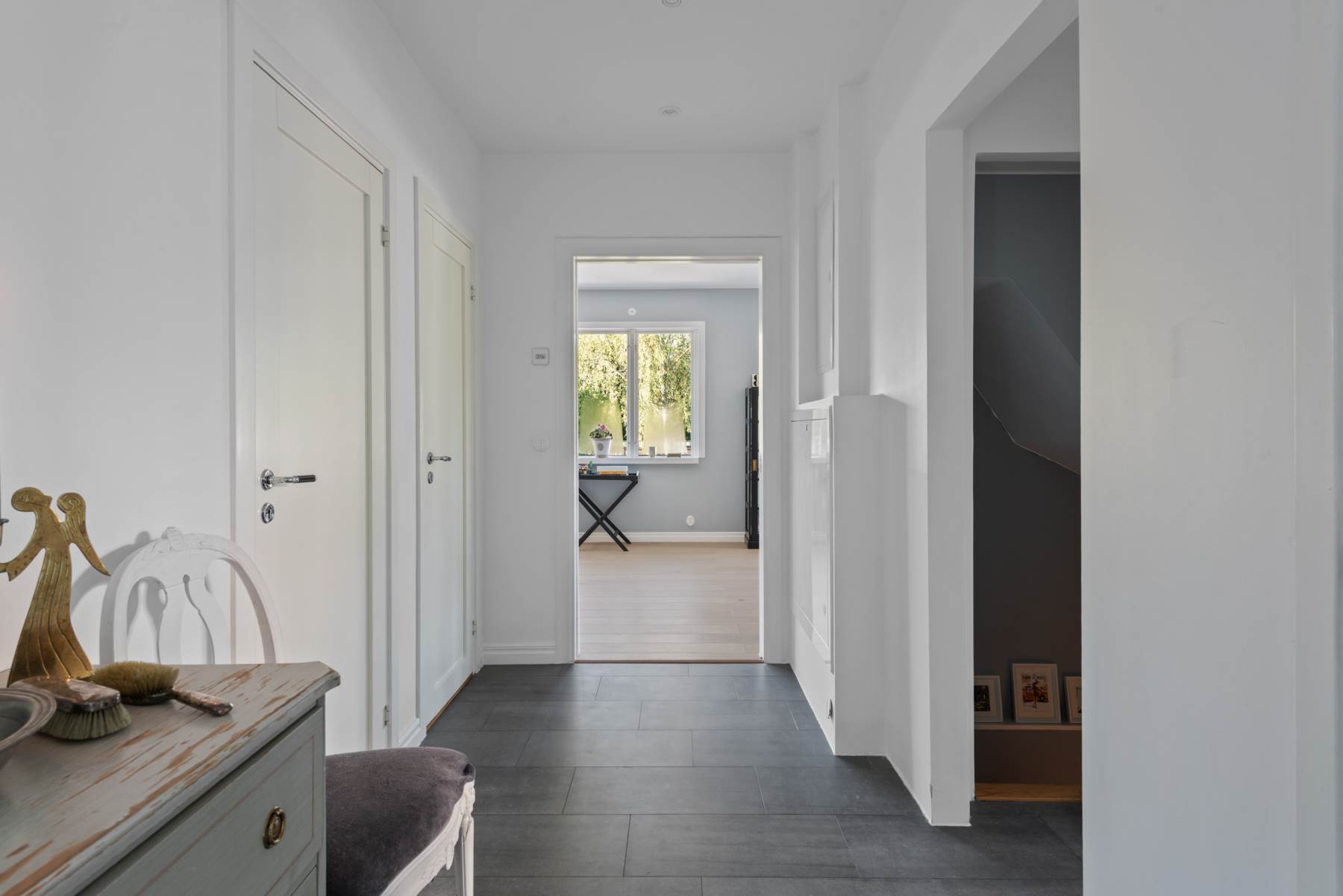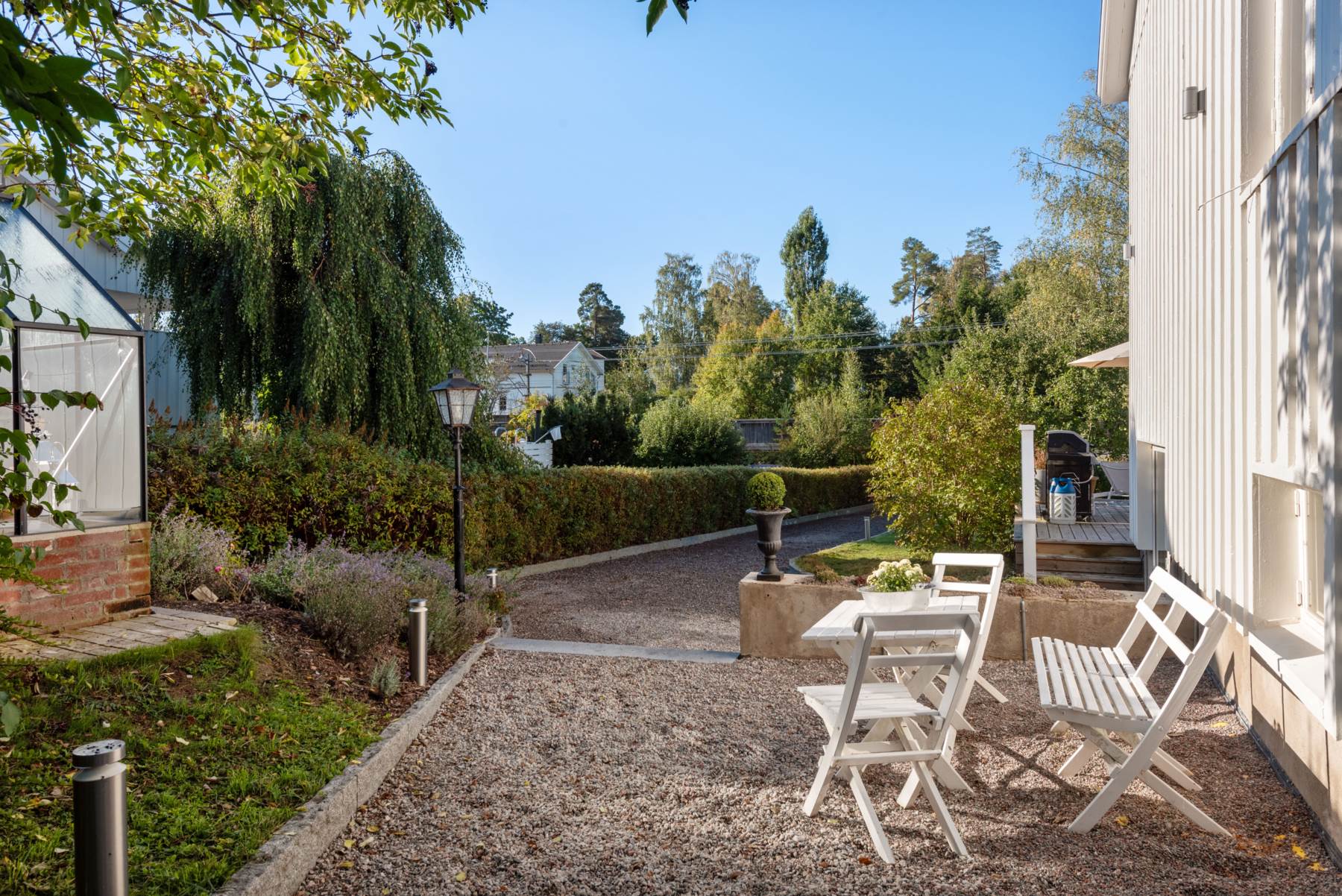 Smakfullt och mycket välplanerat hus ritat av Sixten Magnusson med upp till fem sovrum som har genomgått en omfattande renovering in i minsta detalj. Grönskande, plan och mycket lekvänlig tomt med ett fint stämningsfullt växthus, vackra blommor, planteringar och äppelträd. 200 kvm avsatt odlingsyta med odlingsbäddar och växthus för självförsörjning av grönsaker. En dröm för den odlingsintresserade! Flertalet uteplatser i olika väderstreck inklusive separat grillplats för umgänge och häng. Genomgående en röd tråd i huset vad det gäller färg, form och materialval. Det trivsamma huset har stora sociala sällskapsrum med stora fina fönsterpartier och utgång till en generös altan i soligt läge och utsikt över den grönskande tomten. Stilrent kök med gott om arbetsytor och förvaring samt utgång till ytterligare en altan, perfekt för morgonkaffe i solen. På övre plan finns två bra sovrum samt en övre hall med plats för fåtölj eller arbetsplats. Här finns även en wc samt tvättmaskin. Inredd källare med separat grovingång, allrum, två bra sovrum samt pentry och tvättstuga med dusch. Separat wc. Här finns bra möjligheter för uthyrning, tonåringar, gäster eller barnflicka. Ytterligare 18 kvm ej mätvärd area pga. snedtak.