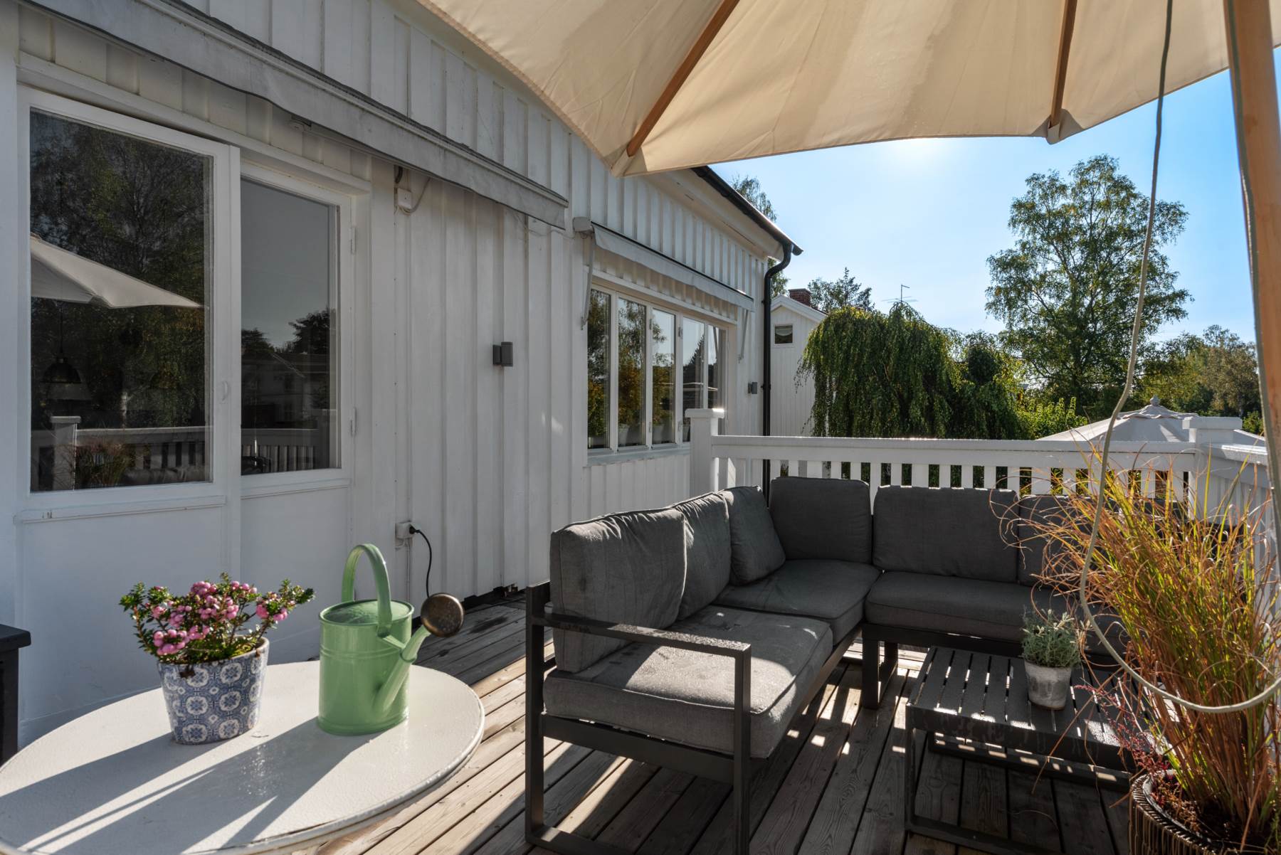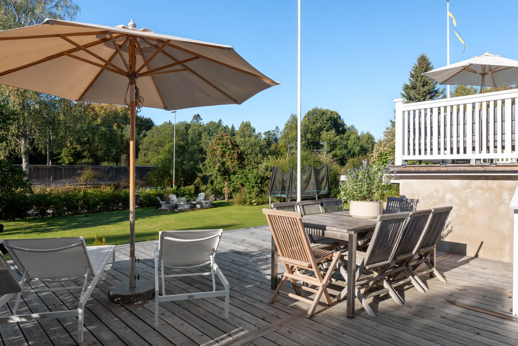 Generöst sällskapsrum med öppen spis och stora fönsterpartier i flera väderstreck. Ljust målade väggar och fina trägolv. Utgång till en härlig altan i soligt söderläge. Här är det sol till sen kväll. Från den fina altanen når man den grönskande tomten med plana gräsytor som inbjuder till umgänge och lek för dom små. Sällskapsrummet har plats för såväl soffgrupp som matsalsdel för stora sällskap.