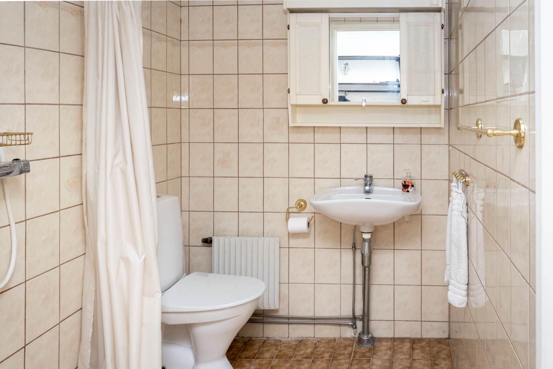 Det gamla garaget är ombyggt och används i dag som hobbyrum samtidigt som det erbjuder fina förvaringsmöjligheter. Här finns en praktisk groventré samt klinkergolv med golvvärme.