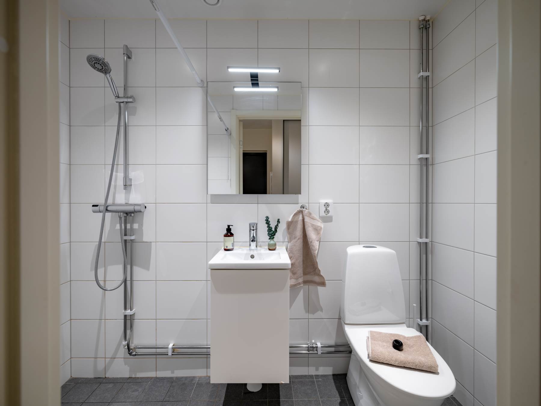 Helkaklat duschrum med vitt kakel och mörk klinker, duschhörna med handdusch. Tvättställ i vit kommod med förvaring under och spegel med belysning ovan. Wc.