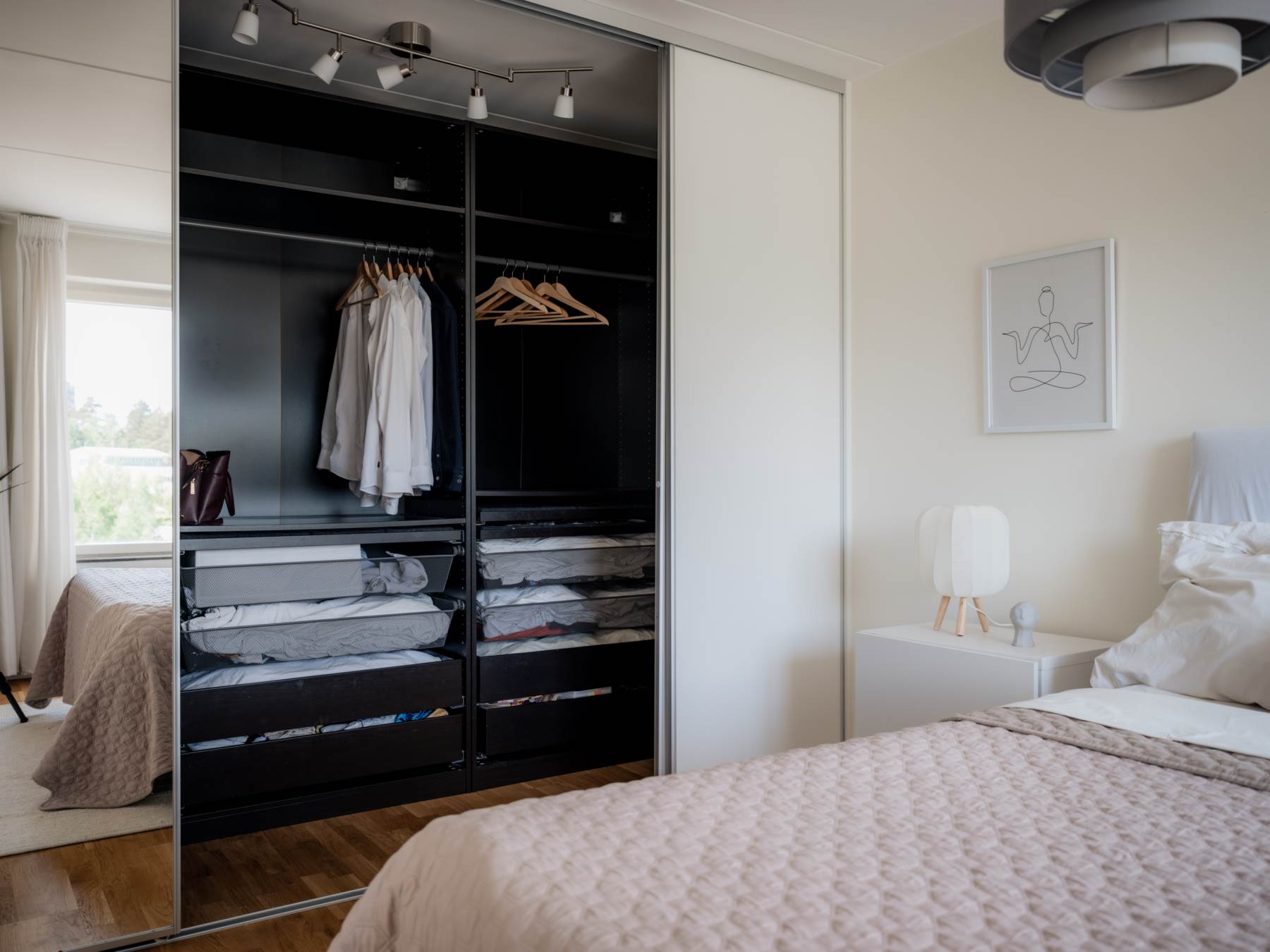 Väl tilltaget sovrum med plats för dubbelsäng, skjutdörrsgarderob längst ena väggen för bra klädförvaring. Ekparkett på golvet och ljusmålade väggar.
