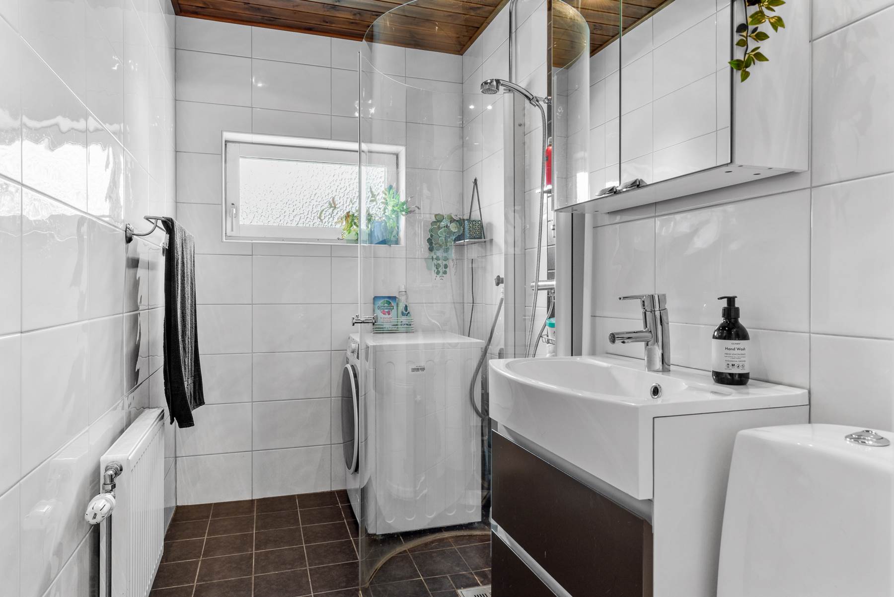 Duschrummet består av WC, dusch, tvättmaskin och golvvärme. Detta gjordes ca. 2010. Duschrummet är väldigt ljust tack vare valet av färger av kakel samt ett litet fönster som ger det lilla extra.