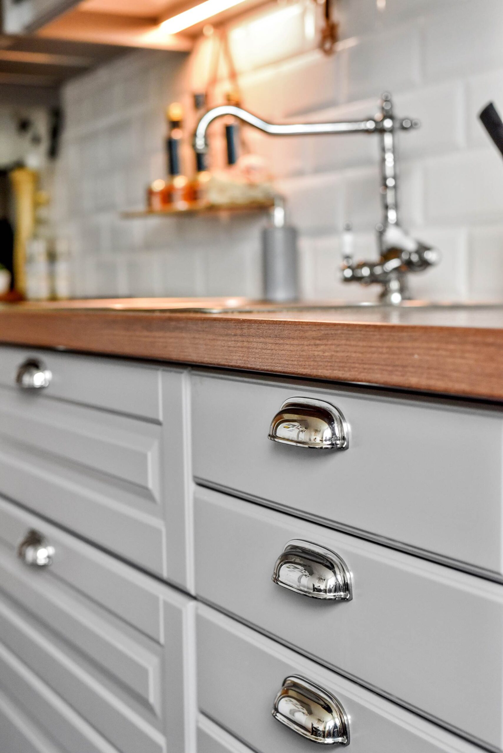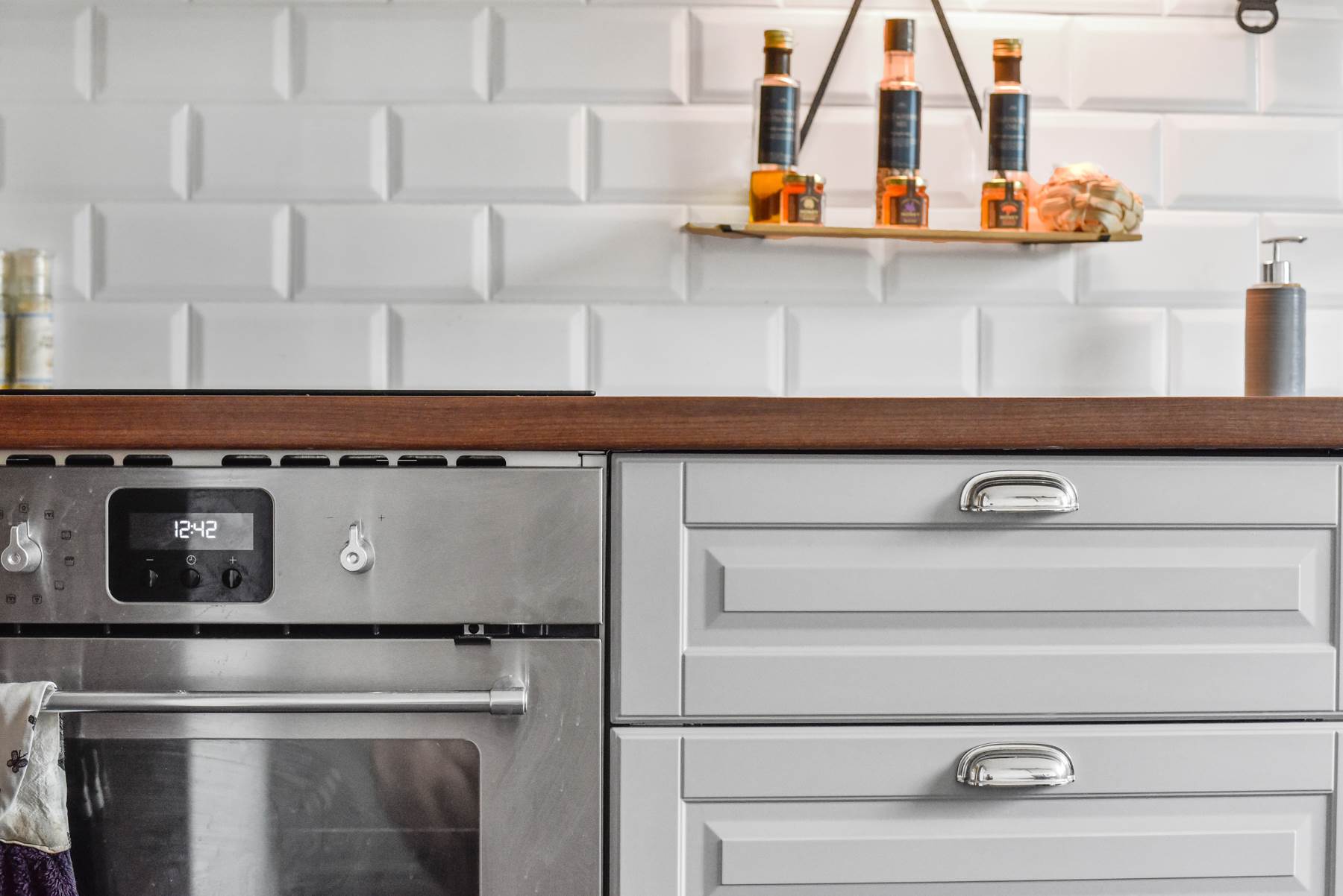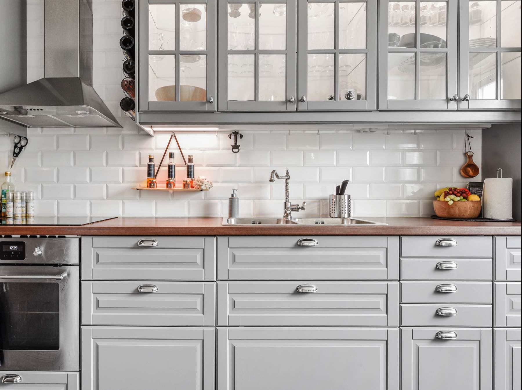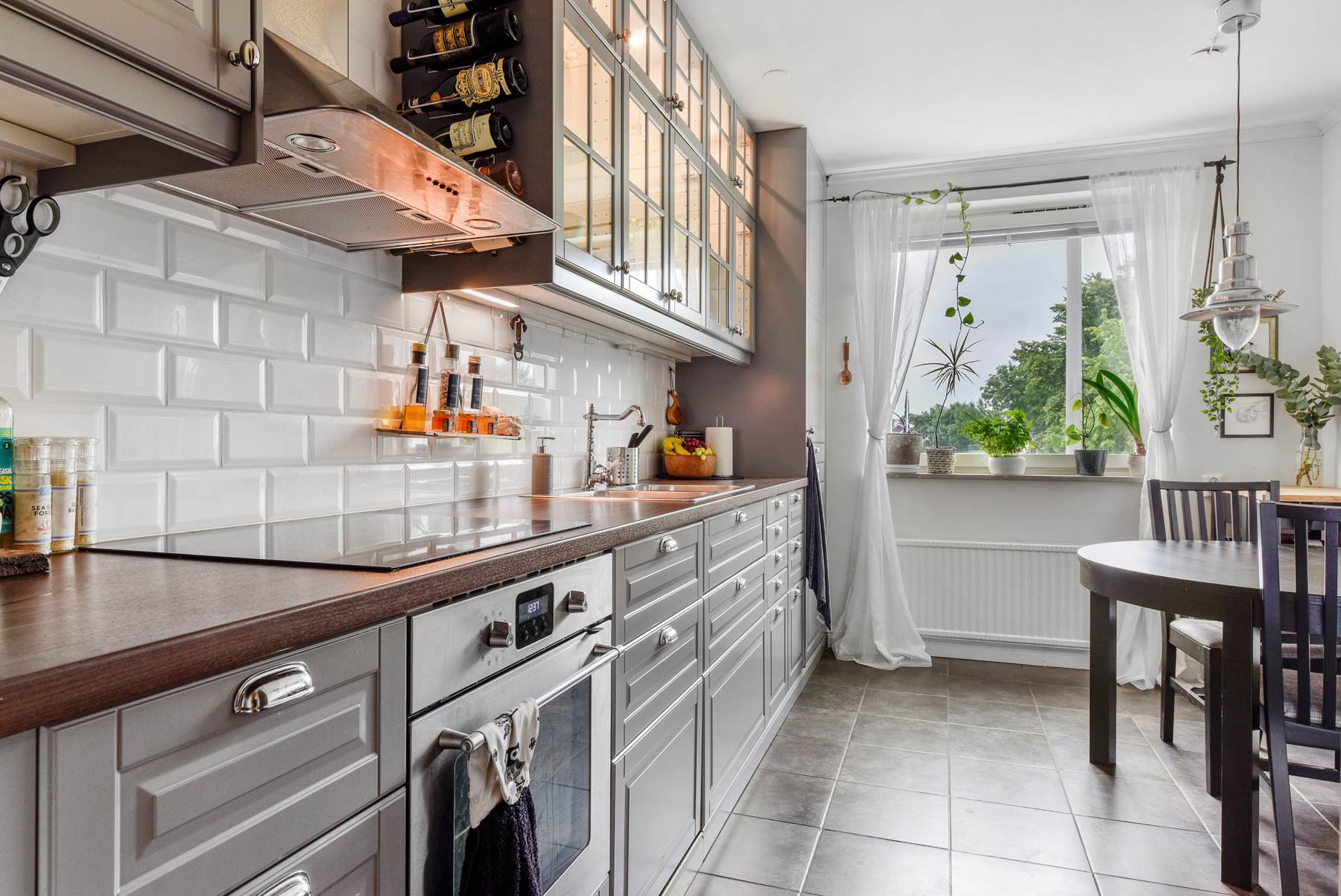 Köket renoverades för 2-3 år sedan med ljusa skåpsluckor, inbyggd diskmaskin och vackra silver detaljer. Golvet är mörkt och trendigt. I köket får man även plats med ett matbord.