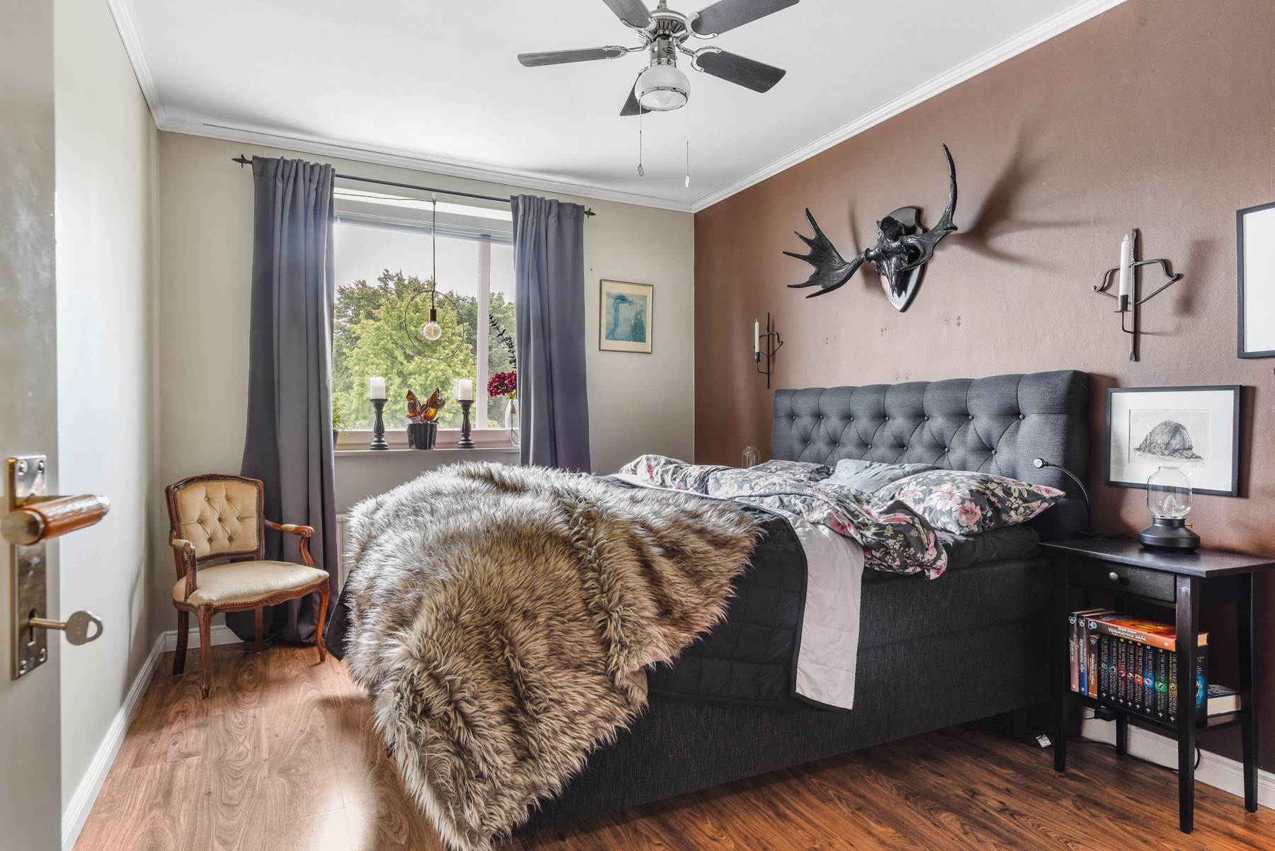 I första sovrummet finner vi även där jordnära färger med mycket plats för både säng och förvaring.