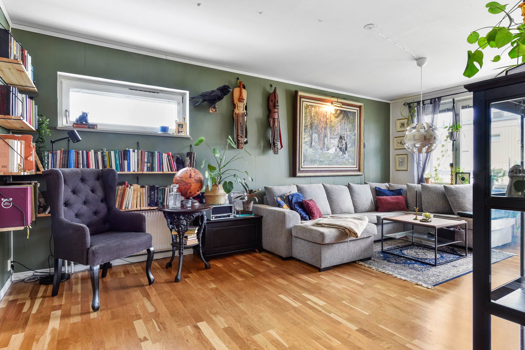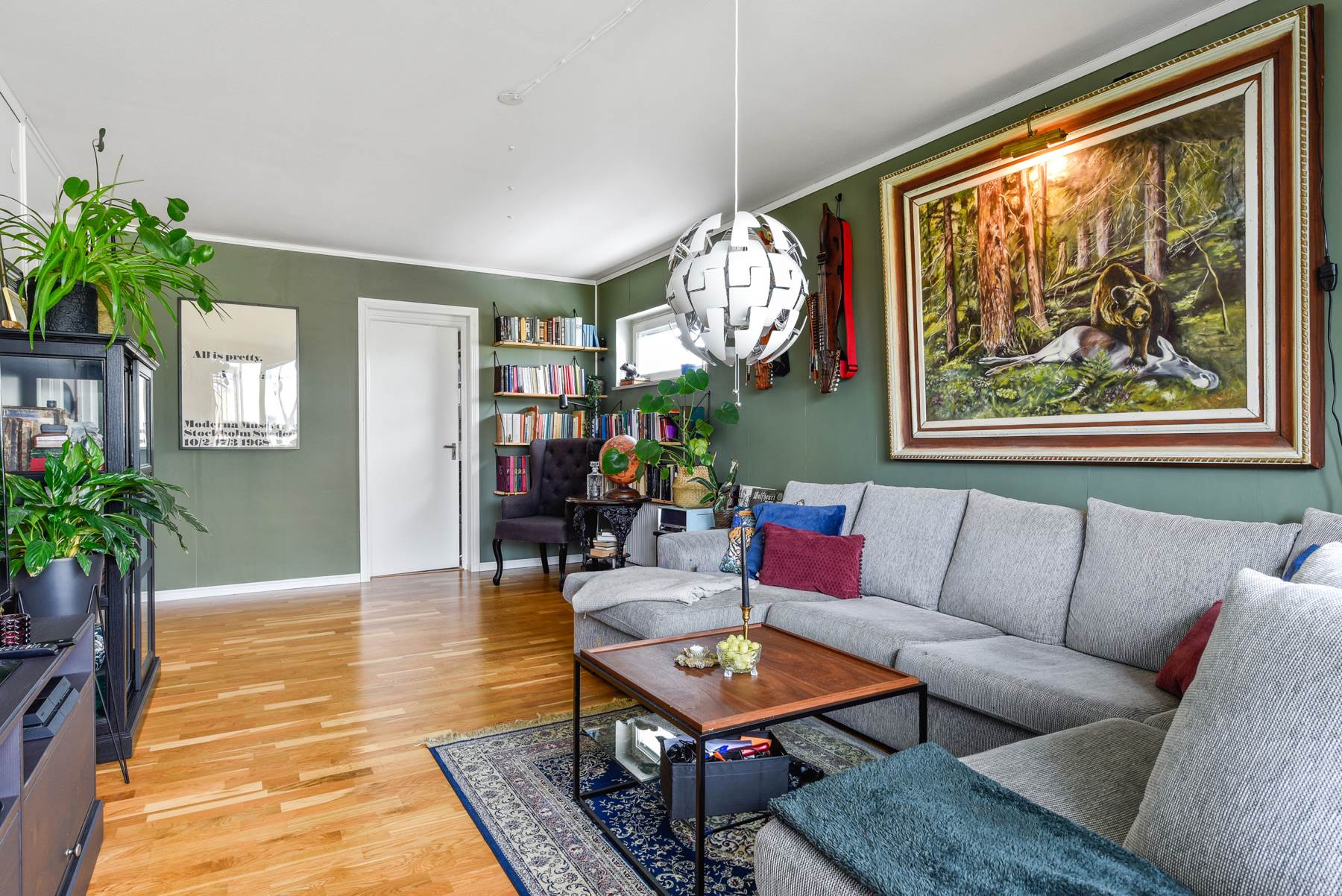 Vardagsrummet är nytapetserat med moderna färger och med samma parkettgolv som i hallen. Vardagsrummet är rymligt och där får man plats med en stor soffa så hela familjen får plats och mindre matgrupp.