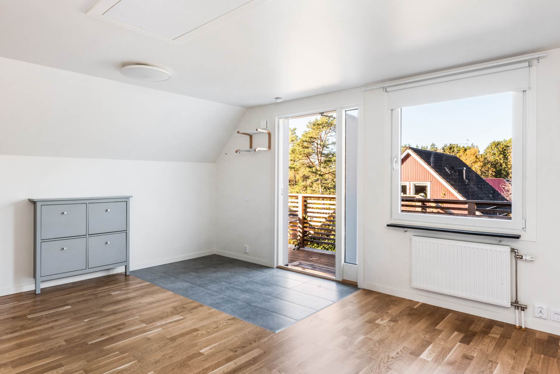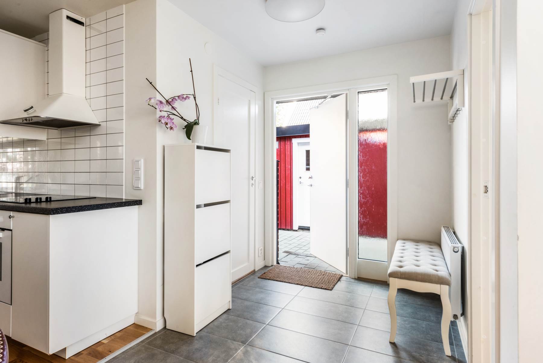 Direkt när du kliver in i hallen upplever du den öppna planlösningen och det fina ljusinflödet. I hallen finns utrymme att hänga av dig ytterkläder och skor.