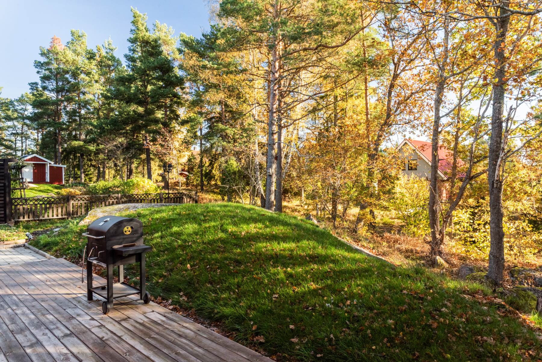 Ett garage finns vid uppfarten och här har man satt upp skiljevägg så det nu innefattar 3 st förråd. Önskar man ha bil så är det inga problem att ta ner skiljeväggen. I de stora förråden finns gott om plats för förvaring av trädgårdsverktyg och möbler.