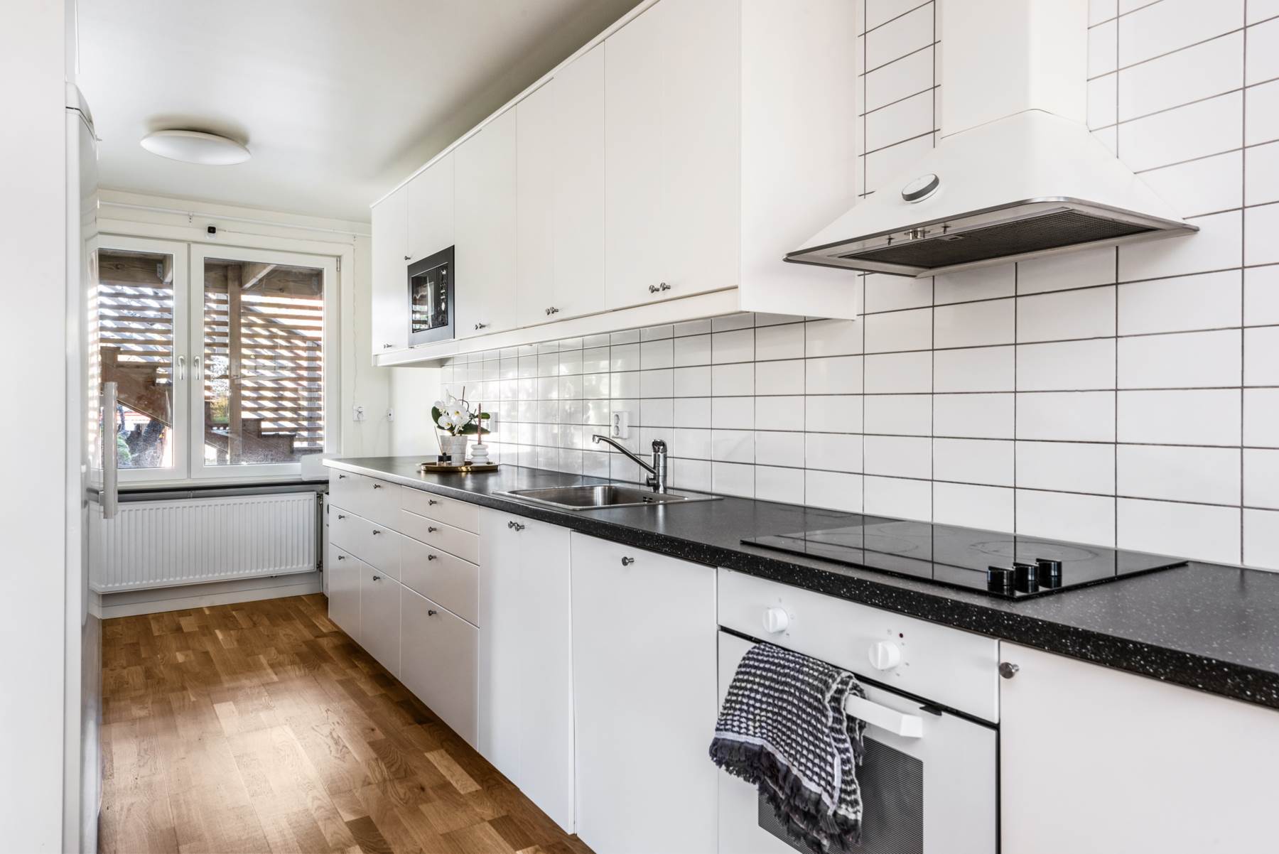 Köksinredningen går i vitt och här finns gott om matlagningsytor på bänkskivor som går i svart. Den maskinella utrustningen består av kyl och frys, diskmaskin, spis, fläkt och micro. Matplatsens placering ligger perfekt mellan kök och vardagsrum som gör detta till en självklar plats där hela familjen samlas, trivs och umgås.