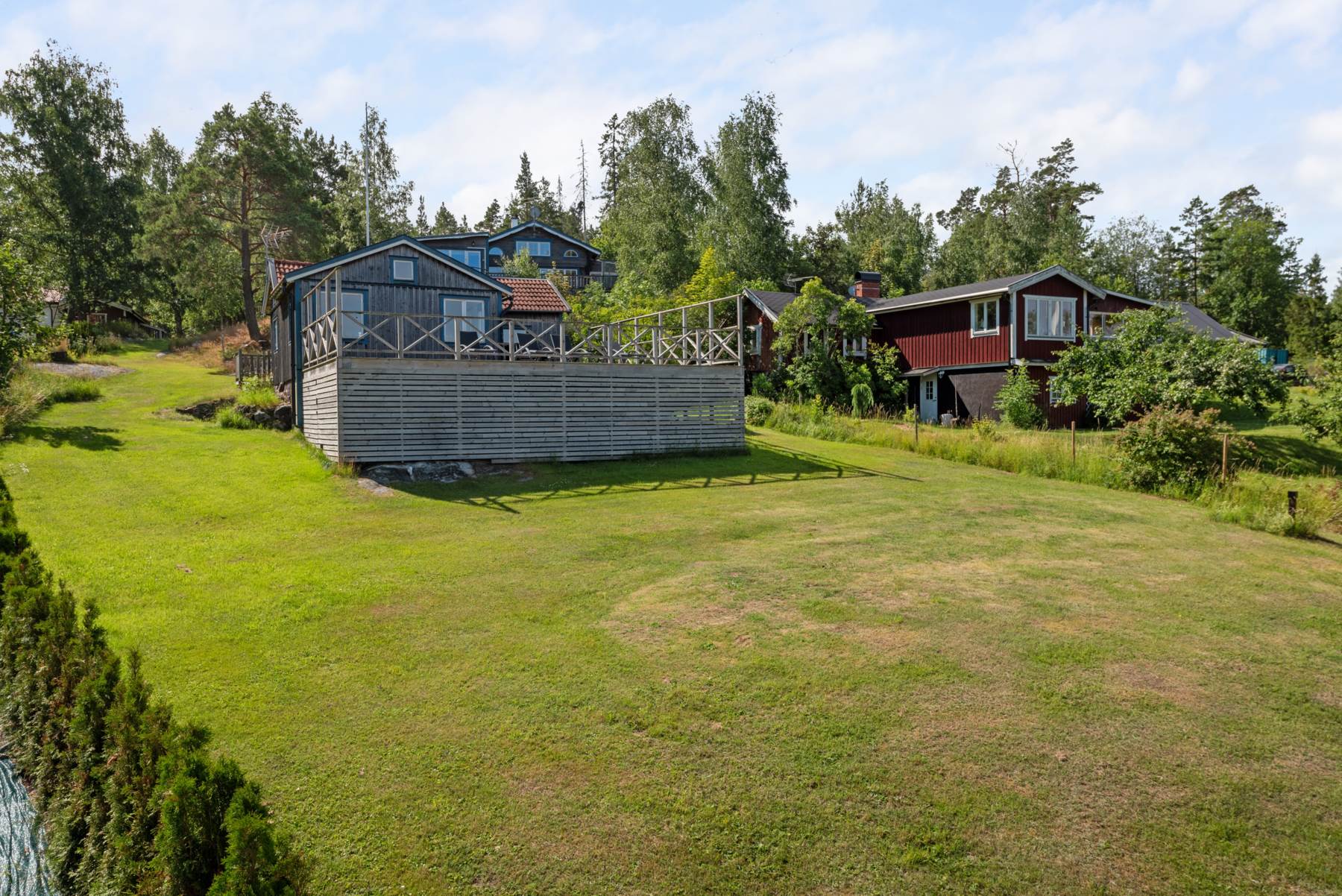 Huset, med namnet Edsbacka, är i grunden ett äldre hus som är tillbyggt och smakfullt uppfräschat samt moderniserat. Här finns en stor trädäckad altan i frontline mot stranden, solen hittar till altanen från morgon till kväll. Läget några meter över havet ger fastigheten en behaglig vy över Furusundsleden.