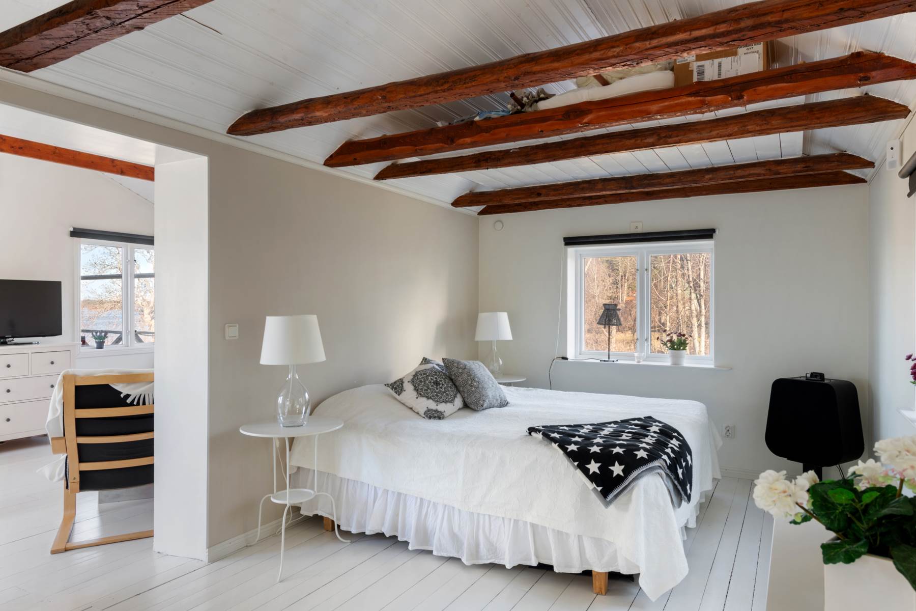 Huset har målade trägolv, genomgående ljus färgsättning och synliga takbjälkar. Här finns kök och helkaklat duschrum med förbränningstoalett. Rymligt vardagsrum med fönster mot havet samt utgång till altanen. Under altanen finns förvaringsutrymme, bra för utemöbler och annat praktiskt. På entrésidan så finns det även en uteplats en liten upp på berget.