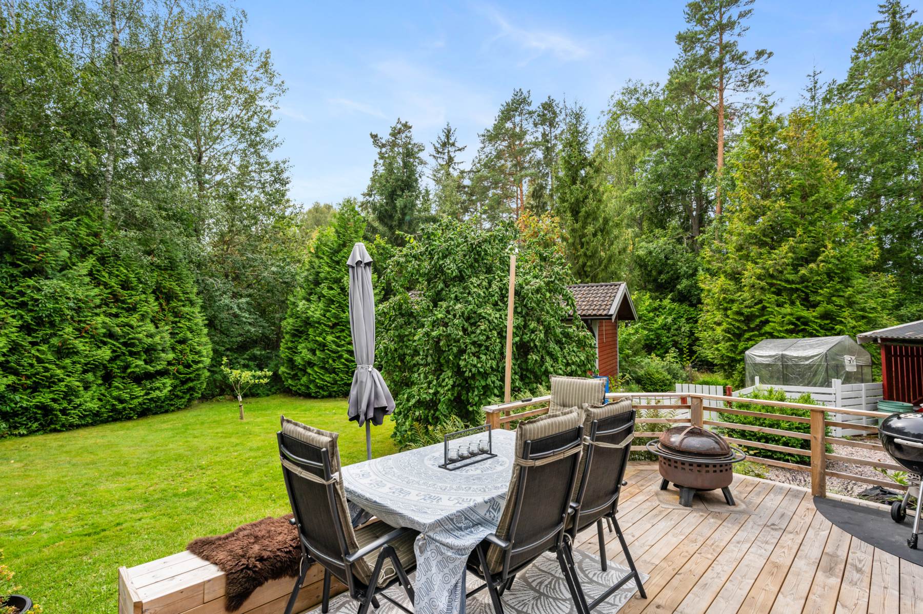 Mot den lummiga och privata baksidan hittar ni den soliga altanen som blir den självklara platsen för sommarens alla måltider och avkopplande stunder. Här kan ni njuta av naturens lugn med en kopp kaffe eller en härlig middag med familj och vänner.